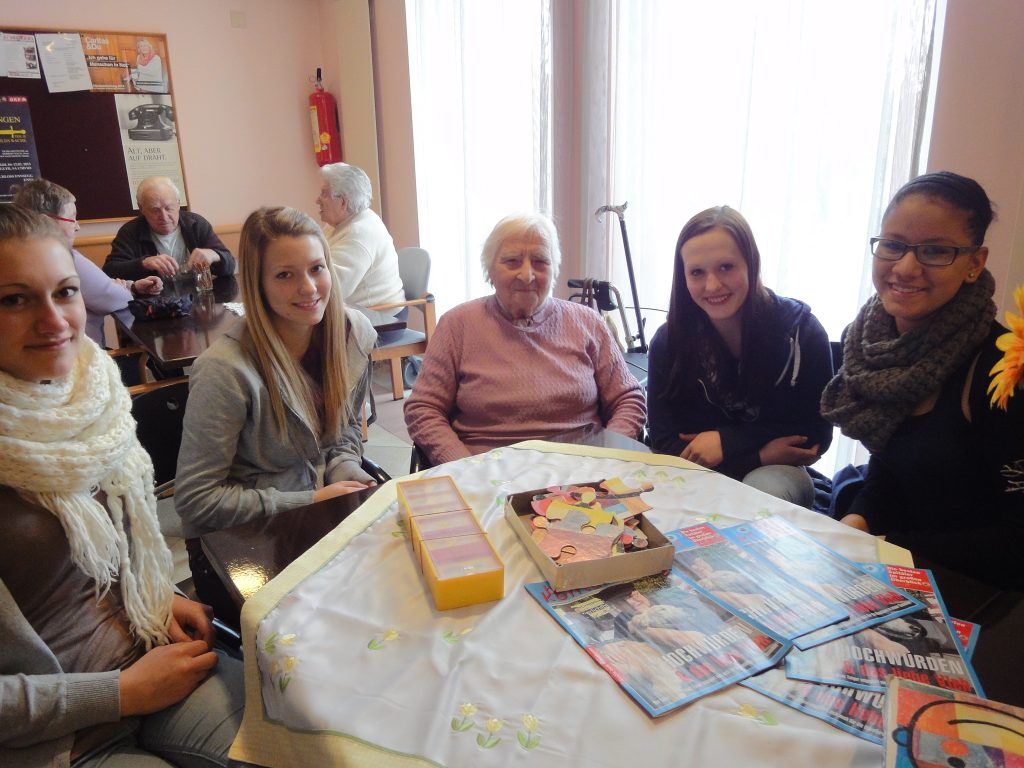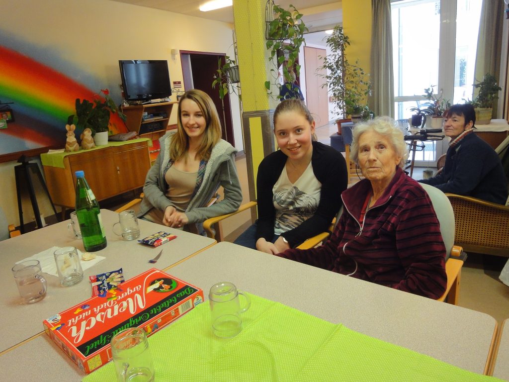 Nachdem einige Schülerinnen bei der Jugendsozialaktion im letzten Oktober 3 Tage im Altenheim Enns verbracht und dabei erste Kontakte mit den BewohnerInnen geknüpft hatten, wollten wir "unsere" alten Menschen dort wieder besuchen. Als kleine "Fastenaktion" gedacht, fanden sich an 2 vorgesehenen Nachmittagen auch neu interessierte Oberstufenschülerinnen, z.B. 8-Klasslerinnen, die nach der Matura ein „Freiwilliges Soziales Jahr“ machen wollen. Die Erzählungen vor allem der alten Frauen aus alten Tagen beeindruckten uns wieder sehr. Einfache Kinderspiele wie Domino, Mensch ärgere dich nicht, oder Wortsilben zusammensetzen ermöglichten Spaß und unkomplizierte Kontaktaufnahme. Die alten Menschen freuen sich immer über unserer Besuche und wir lachen schon, wenn sie wieder betonen: "Ihr seid´s aber alle fesche Mädels" – wir finden aber, dass auch die alten Gesichter ihre Schönheit haben. Leider haben wir vergessen, mehr Fotos zu machen! – doch wir kommen sicher mal wieder!