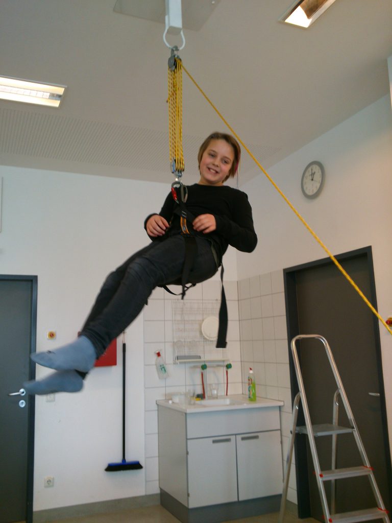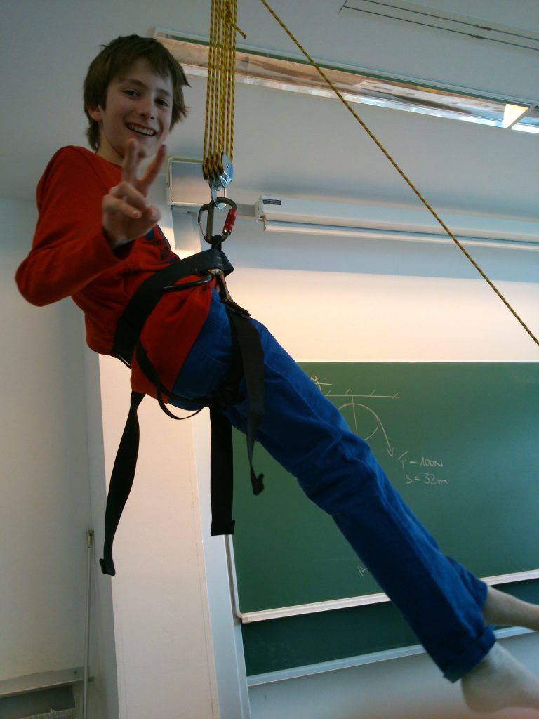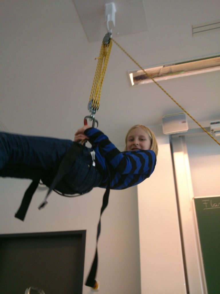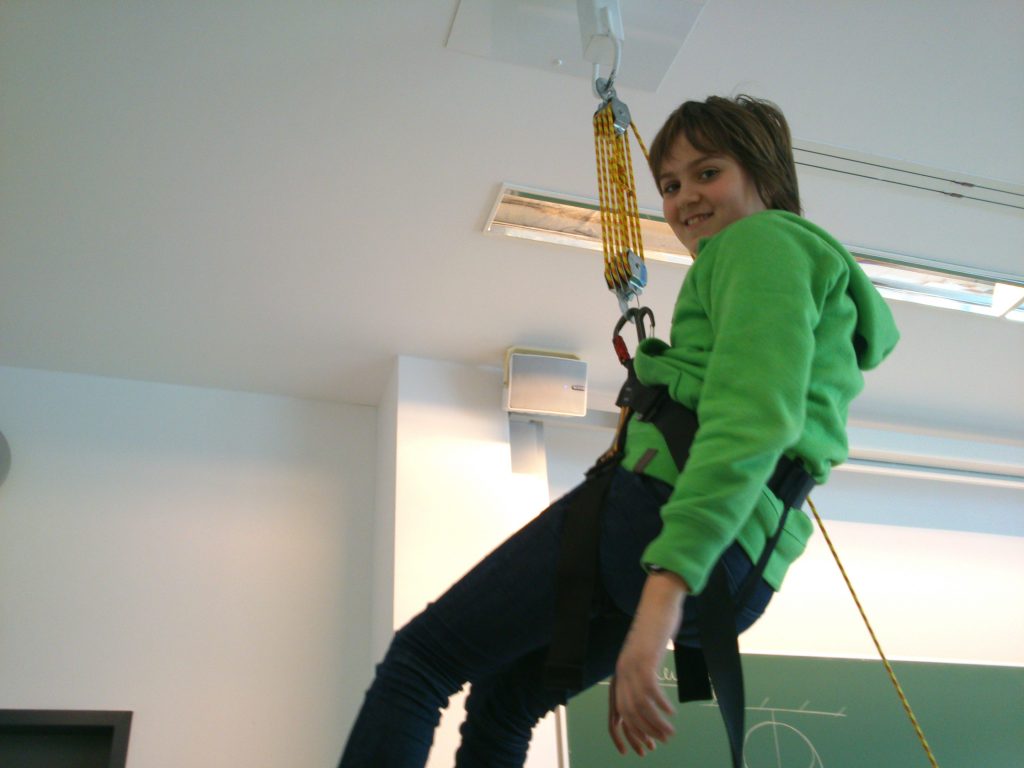 Die Klasse 2B hat mit ihrem Klassenvorstand Mag.a Michaela Hörmann ein Experiment mit einem Flaschenzug durchgeführt. Dieses fand im Physiksaal statt. Dabei zogen wir uns gegenseitig bis zur Decke des Raumes hinauf. Wir stellten fest, dass wir zwar den achtfachen Weg am Seil ziehen mussten, aber dafür nur ein Achtel der Kraft benötigten. Wir mussten auch aufpassen, dass unsere Haare und Hände nicht in die Rollen kamen.