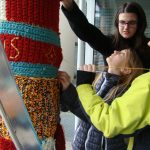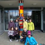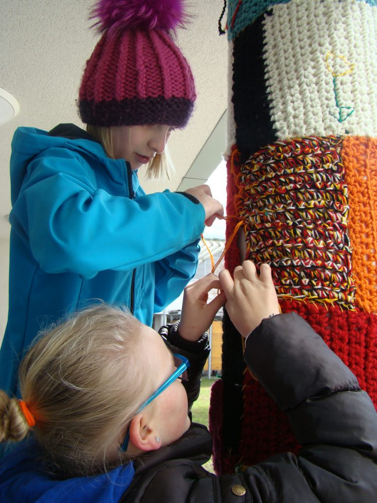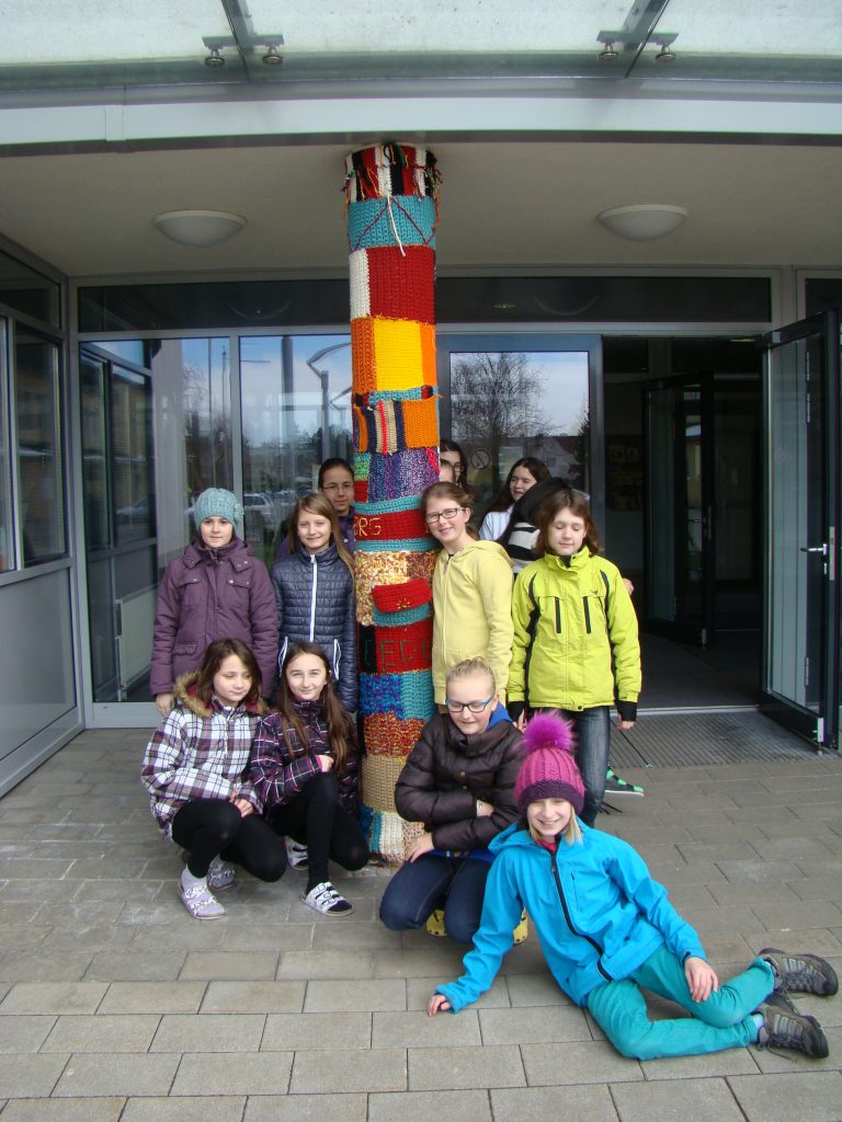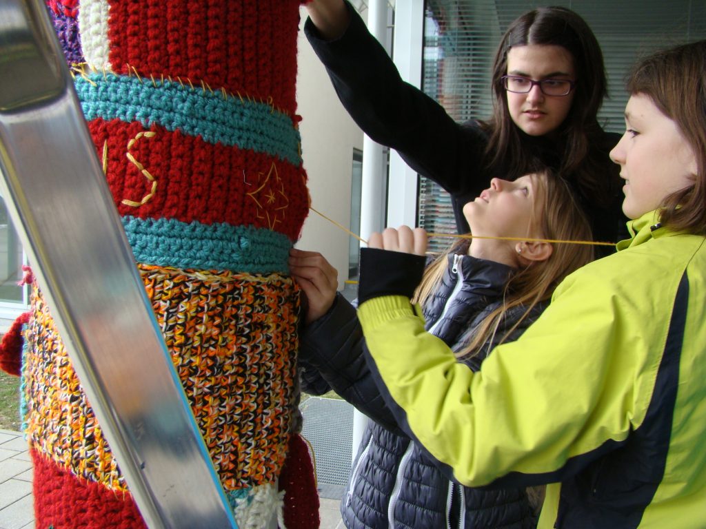 Ende Februar begannen wir, die 2AB, ein neues Projekt im Fach Textiles Gestalten. Als unsere Werklehrerin verkündete, dass wir die Säule vor dem Schuleingang umhäkeln würden, waren wir sehr überrascht und erfreut. Diesen Trend, öffentliche Dinge zu umhäkeln oder zu umstricken, nennt man „Guerilla Knitting“, „Yarn Bombing“ oder „Urban Knitting“.