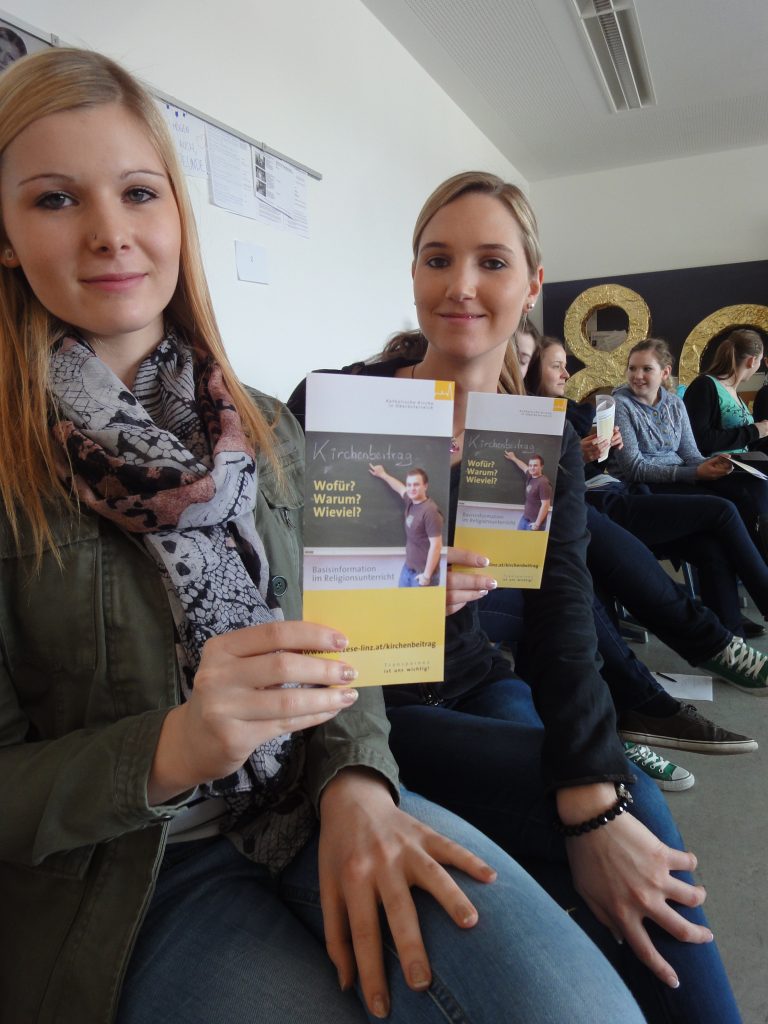Am Montag 8.4. kamen zwei Referentinnen aus der Kirchenbeitragsstelle Linz in die 8G Klasse für 2 Einheiten in den kath. Religionsunterricht. Wir erfuhren zunächst Basisinformationen, wie andere Religionen ihren „Kirchenbeitrag“ organisieren, und wie der Kirchenbeitrag der katholischen Kirche in anderen Ländern gehandhabt wird. Was sind die "Für-und Wider" z.B. beim System der Kirchensteuer (Deutschland), Kultursteuer (Italien) und in anderen Ländern, oder wie in Österreich einem Kirchenbeitrag, der zusätzlich „individuell“ bearbeitet werden kann. Wie wird der Beitrag berechnet, wie hoch ist der Absetzbeitrag und wozu wird das Geld verwendet?