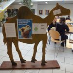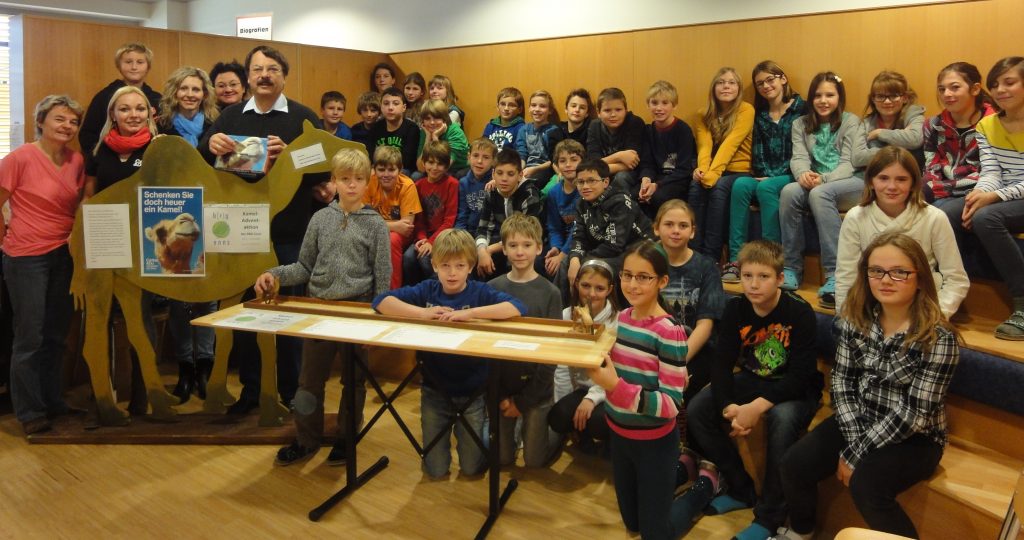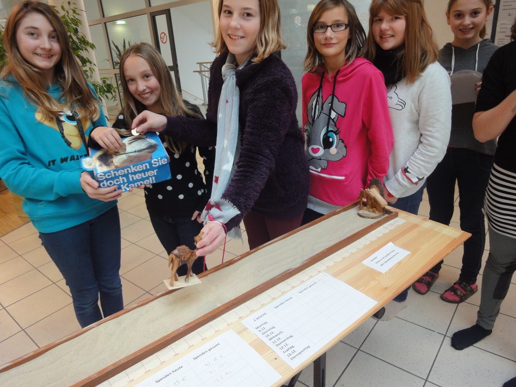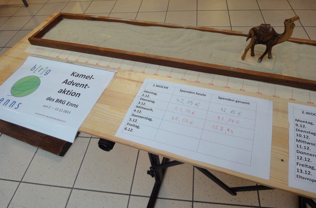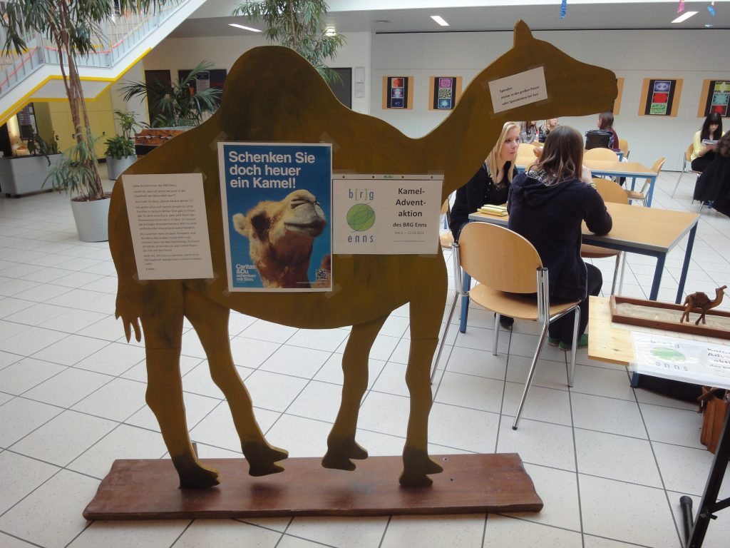 Schon im vorigen Advent hatten drei Klassen über die beliebte Caritasaktion „Schenken mit Sinn“ drei Esel für Frauen in Äthiopien gekauft. Heuer steckte sich Prof. Reinhilde Spiekermann ein größeres Ziel: Die Schule kauft ein Kamel für 370 Euro! Zwei junge engagierte Caritasreferentinnen informierten am 2. Dezember sechs Klassen mit einer PowerPoint Präsentation in der Bibliothek, dass es in Kenia aufgrund des Klimawandels inzwischen alle 2-3 Jahre Dürrekatastrophen gibt. So müssen Nomadenfamilien mühsam zu den letzten Wasserstellen ziehen. Dazu brauchen sie dringend Kamele, die wahre Wundertiere sind: Sie helfen als Lasttiere beim Wandern, können monatelang ohne Wasser überleben, sind genügsam beim Essen (auch bittere und dornige Kräuter), trinken sogar salziges Wasser, geben Milch und auch Haare und Fell werden verwendet. Außerdem leben Kamele bis zu 40 Jahre lang. Schnell waren die SchülerInnen motiviert für ein Kamel zu spenden. In der Aula stehen auf einem großen gebastelten Holzkamel die Informationen. In eine Spendenbox kann jederzeit Geld eingeworfen werden, weil die Box den ganzen Tag bei Susis Buffet steht. Herzliches Danke an Susi, die uns beim Sammeln tatkräftig unterstützt! Als Hit entpuppt sich die anschauliche Spendenlatte: Auf einem Brett gibt es einen „Wüstenweg“ mit Sand wo ein kleines Kamel aus Holz der Spendenlatte entlang zum Ziel – nämlich 370 Euro – geschoben wird. In der großen Pause werden das große Holzkamel und der Wüstenweg in die Mitte der Aula gerückt und die Vorbeigehenden zum Spenden motiviert. Jede/r, ob groß oder klein, möchte das Kamel weiterschieben: „Wie weit ist unser Kamel schon?“ interessieren sich fast alle SchülerInnen und viele wollen das kleine Kamel weitergerückt sehen.
