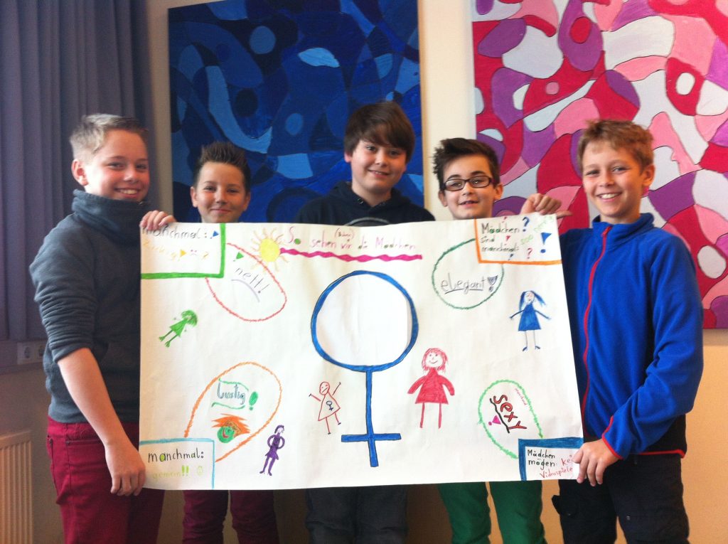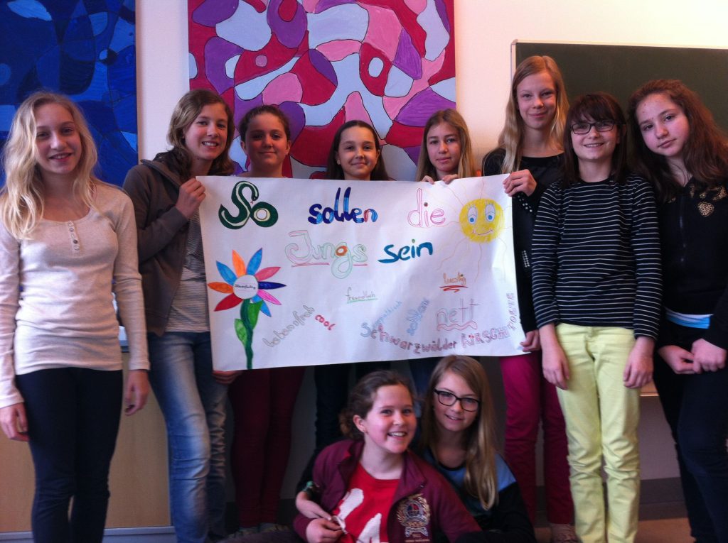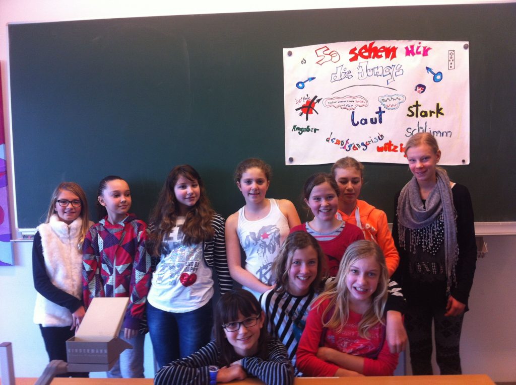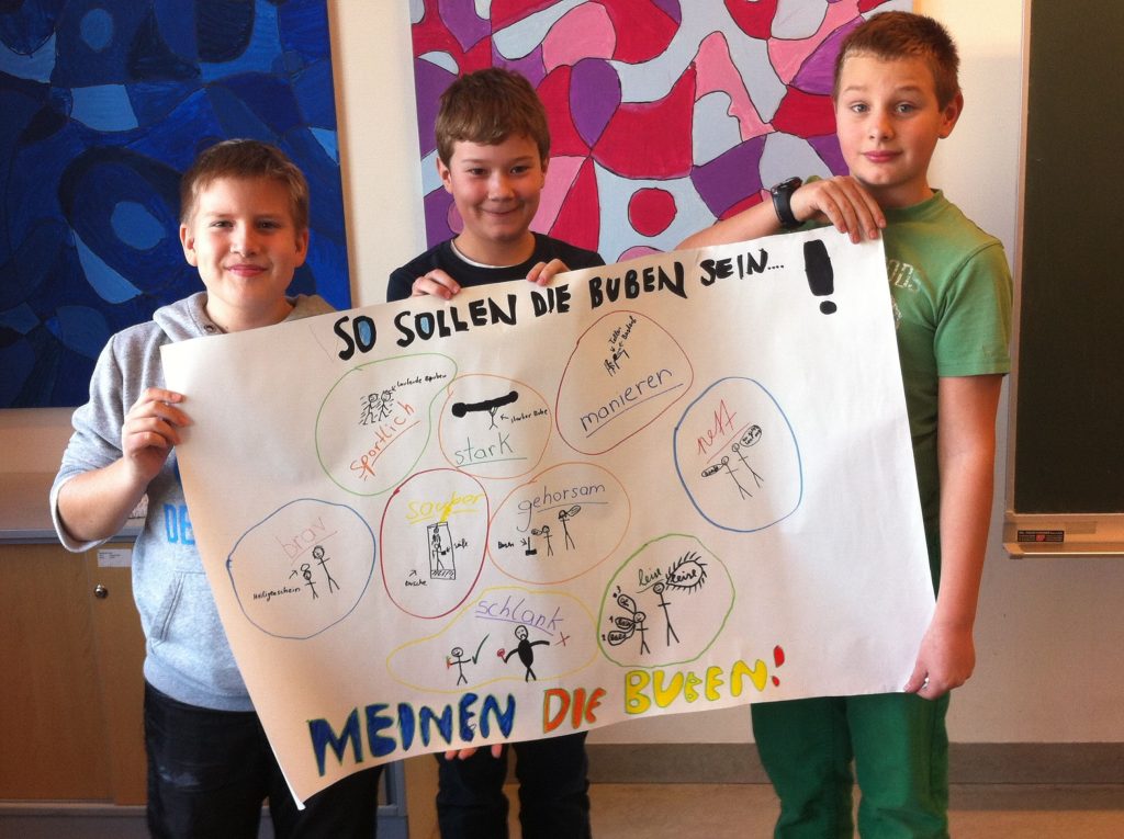Ausgehend von dem sehr lustigen und spannenden Jugendbuch „Mister Fantastic und Miss World“ von Bernd Schreiber arbeitete die 2D im Deutschunterricht an einem Projekt, um herauszufinden, wie Buben und Mädchen sich verhalten, bzw. wie sie das jeweils andere Geschlecht sehen und erleben. Dazu besprachen sie Rollenbilder und fertigten in Kleingruppen Plakate an, die unterschiedliche Sichtweisen aufzeigen sollten. Vor allem auf die Gegenüberstellung von Selbstbild und Fremdwahrnehmung wurde dabei ausführlich eingegangen. Als Gesprächsgrundlage dienten anonyme Fragebogen zu Fragen wie: Was gefällt dir am Benehmen von Buben / Mädchen? Was gefällt dir am Verhalten der Buben / Mädchen nicht? Wer hat welche Freizeitbeschäftigungen und wer übt welche Berufe aus? Wie stellst du dir einmal die Aufteilung von Beruf und Hausarbeit mit einem Partner vor? Die Ergebnisse wurden diskutiert und die in Gruppen gestalteten Plakate der Klasse präsentiert.