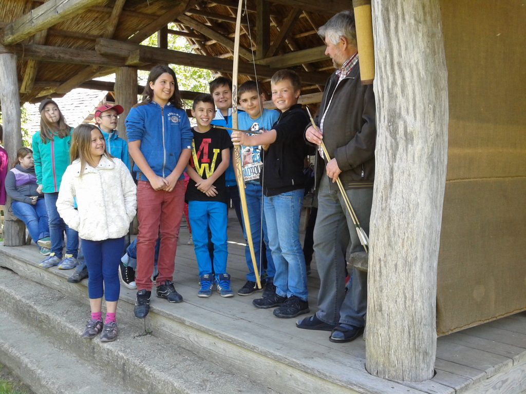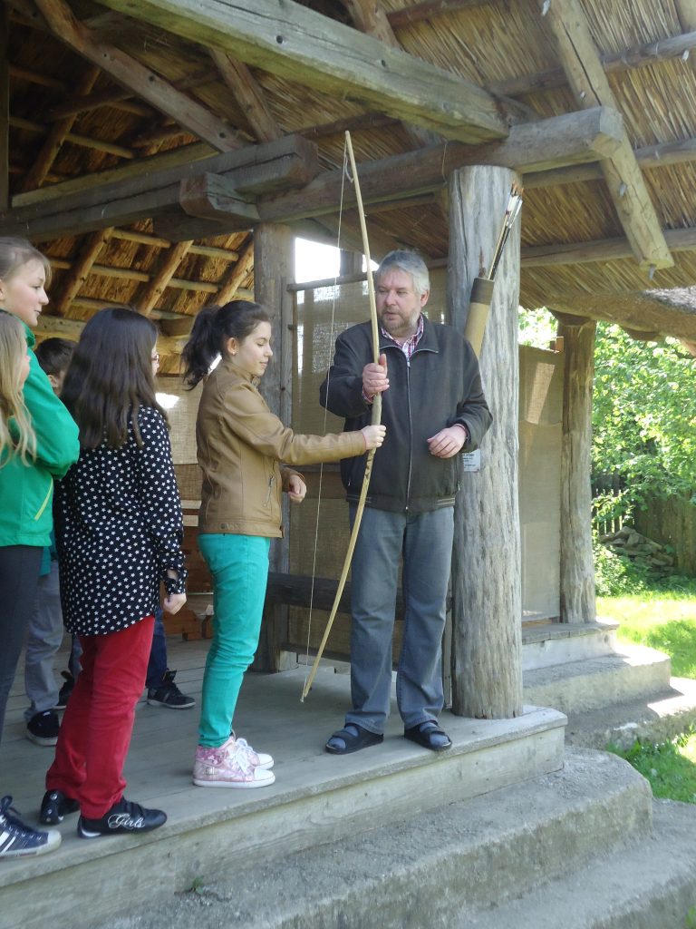 Gleich im Anschluss erwartete uns eine spannende Führung durch das Museum, wo wir ein Hügelgrab, in dem die Dorffrau ruht, sowie das Skelett einer Dienerin sehen konnten. Daneben wurde uns das Modell eines echten Keltenhauses gezeigt, das nächstes Jahr gebaut werden soll. Dann kamen wir zur letzten Station, dem Bogenschießen. Jeder durfte neun Pfeile abschießen. Am Ende konnten die Mädchen der 1B gleich 25 Treffer verzeichnen und die Buben immerhin 21. Die Ergebnisse in der 1E waren ähnlich gut.