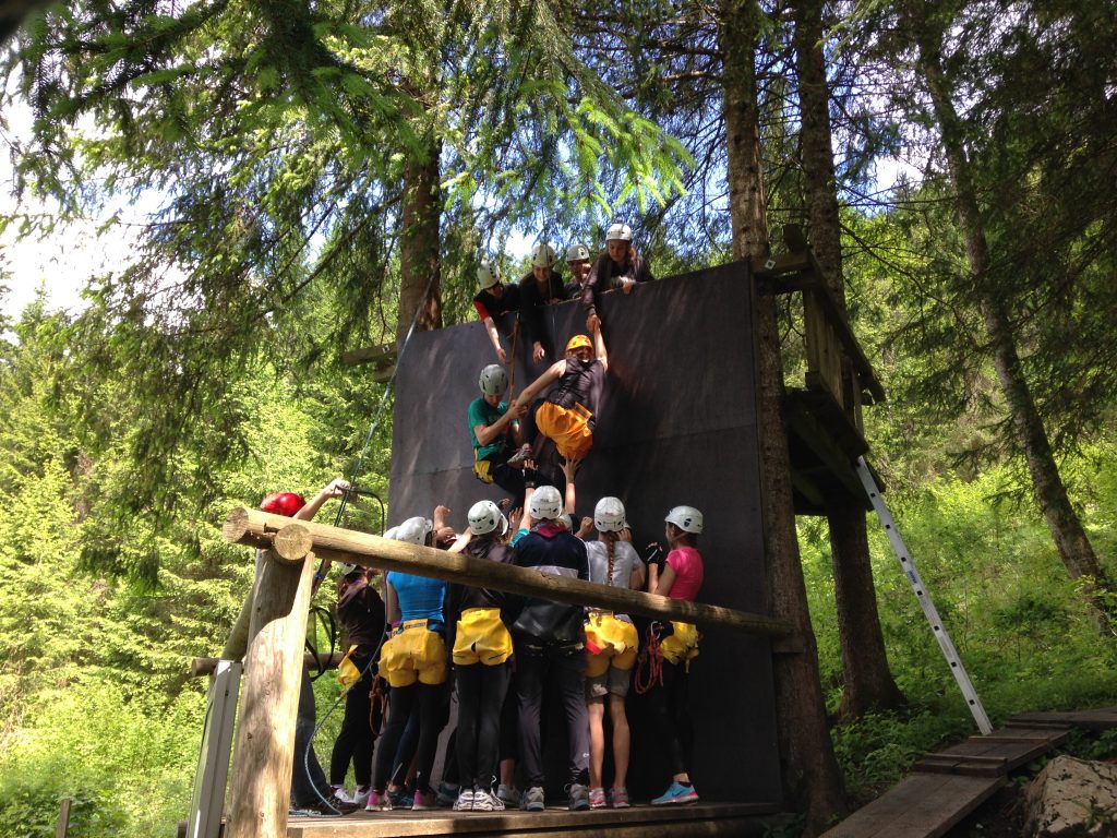Im Mittelpunkt der Woche stand natürlich Sport, also fuhren wir jeden Tag ins Salzatal, wo wir mit den Guides von Freelife, einer Organisation für Outdoorsport, verschiedene Sportarten ausübten, die man zu Hause nicht jeden Tag machen kann. So kämpften wir uns, aufgeteilt in zwei Gruppen, an einem Tag durch den Klettergarten und ein anderes Mal über den anstrengenden Klettersteig, wo wir aber mit einer 100 Meter langen Flying Fox Strecke belohnt wurden. Bei den Sportarten im Wasser ging es mit dem Kajak auf den Badesee, wobei wir aber etwas mit der Wassertemperatur von gefühlten 8°C kämpften und irgendwann unsere Arme auch vom Paddeln taub wurden. Das Highlight der Woche war eindeutig das Raften, bei dem wir in 10-er Booten einige Kilometer auf der Salza zurücklegten und ziemlich nass wurden, die einen durch den Fluss, die anderen durch die ständigen Paddel-Attacken der anderen Boote. Für diejenigen ohne Allroundschwimmschein gab es als Ersatzprogramm Bogenschießen und Geocaching. Am letzten Vormittag hatten wir die Aufgabe in 4 Teams stabile Flößer aus Brettern, Tonnen und Seilen zu bauen, mit denen wir dann den See überqueren mussten, ohne dabei unterzugehen.