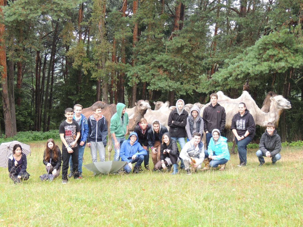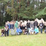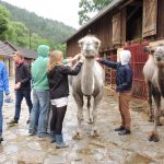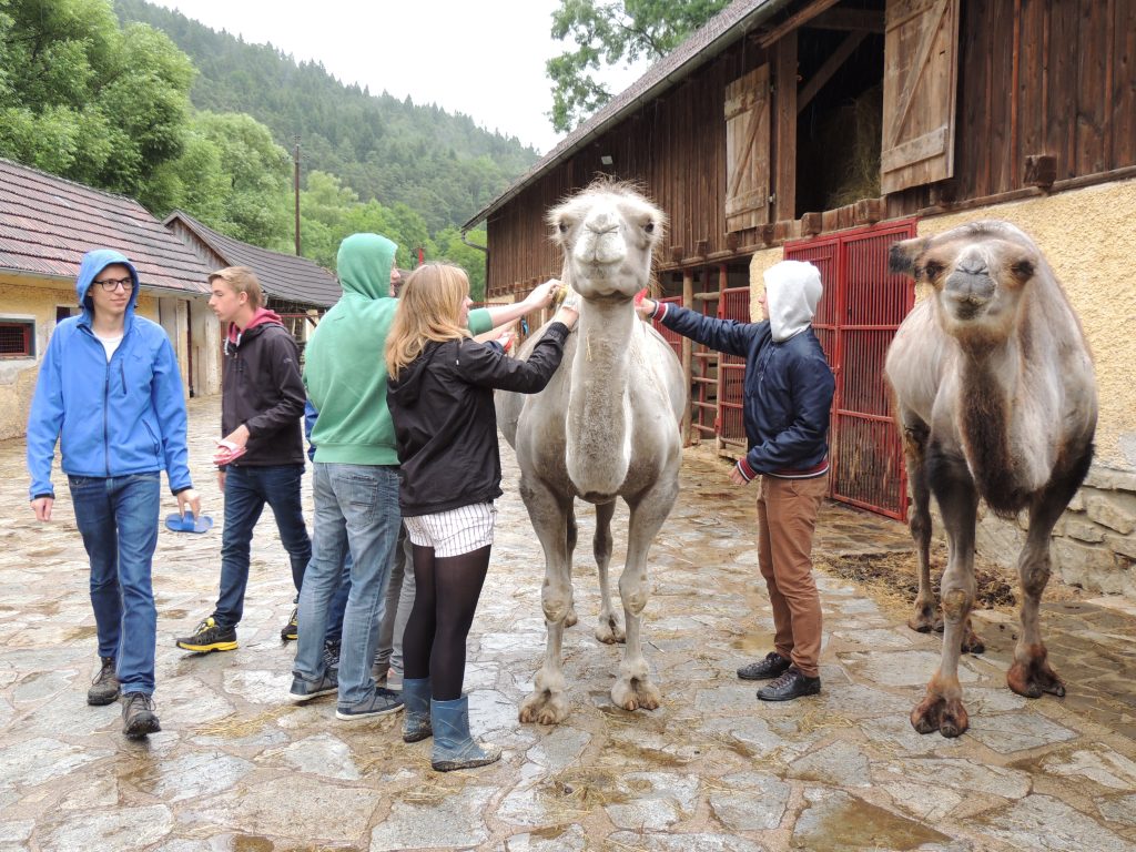 Im Anschluss hieß es: Integration in die Herde. Mit Bürsten durften die Kamele gestiegelt und somit kennengelernt werden. Alle 17 SchülerInnen wurden in der Gruppe Willkommen geheißen und durften nun einen Waldspaziergang mit den sieben Dromedaren und Trampeltieren unternehmen.