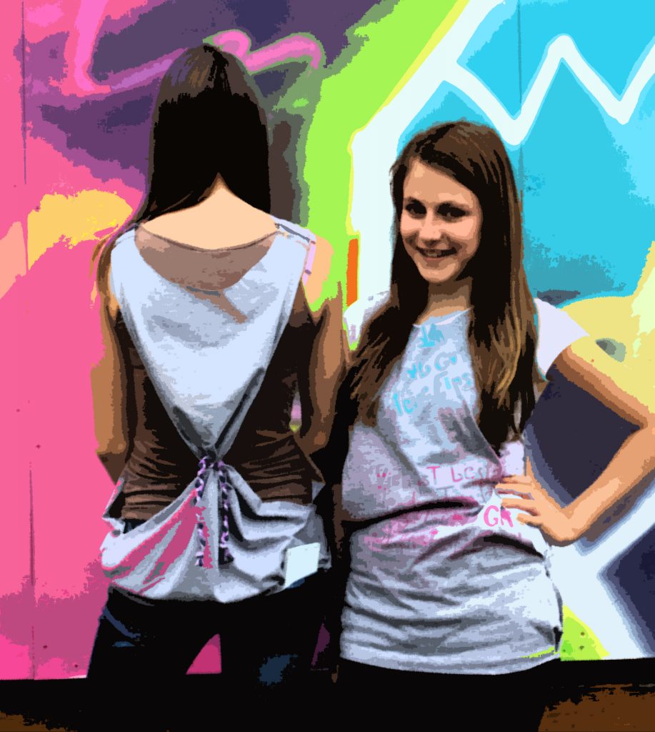 Im textilen Werkunterricht setzten wir uns mit der täglichen Schulkleidung am b[r]g Enns auseinander. Was wird an unserer Schule getragen, was ist „in“ und welche Kleidung stößt auf Ablehnung? Die Einheitlichkeit fällt erst auf den zweiten Blick auf. Denn fast jede Schülerin und jeder Schüler trägt Jeans und T-Shirt in verschiedenen Farben und Variationen. Einerseits herrscht Einheitslook, andererseits besteht der Wunsch nach Individualität. Durch Veränderungen von Jeans und T-Shirt gestalteten die Schülerinnen der 4D und 4E neue Outfits. Danach entwickelten die Schülerinnen aus einem einfachen grauen T-Shirt ein individuelles Kleidungsstück. So wurde aus einem T-Shirt eine Tasche, ein Kleid oder ein neugestaltetes Oberteil.