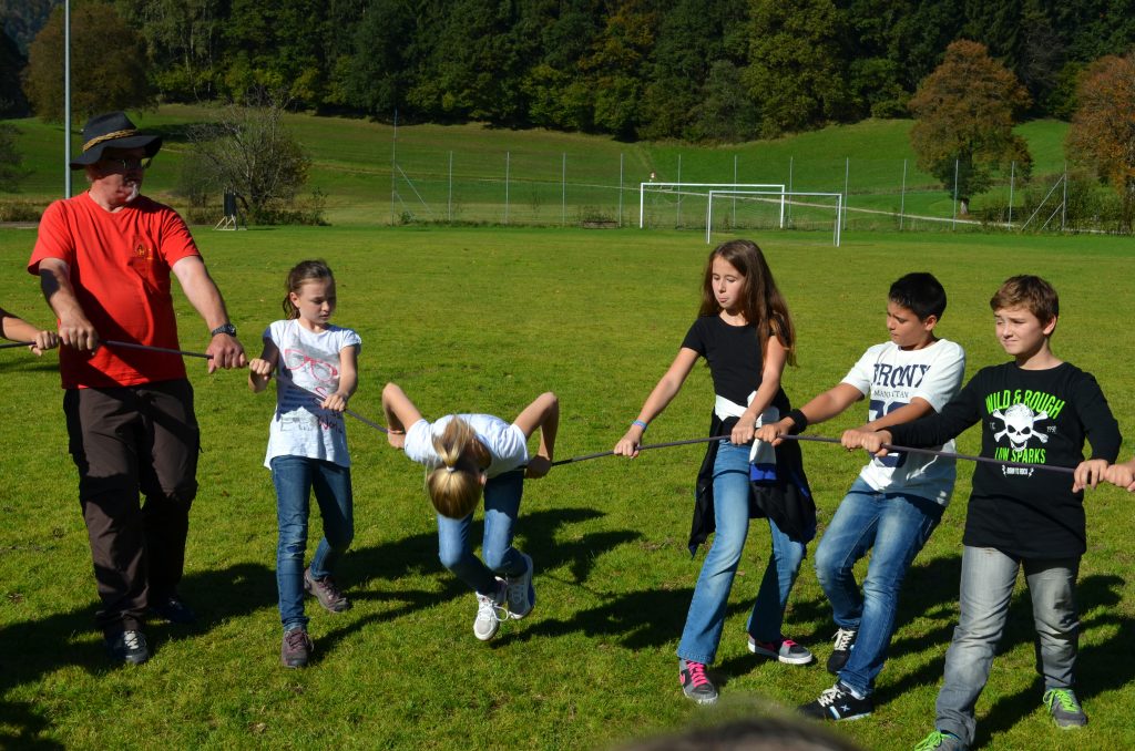 Bald danach wartete eine Übung mit dem Kletterseil auf uns. Wir ließen uns nach hinten kippen, versuchten das Gleichgewicht zu halten und nicht umzufallen. Nun spannten wir das Seil und Frau Professor Füreder balancierte darauf.