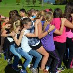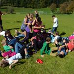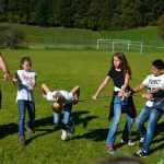 Als vorletzte Übung wartete das Bushaltestellen-Spiel auf uns. Wir bildeten einen engen Kreis und setzten uns langsam auf die Oberschenkel der Person, die hinter uns stand. Dabei fielen aber sehr viele um und wir lachten, bis uns die Bäuche wehtaten.