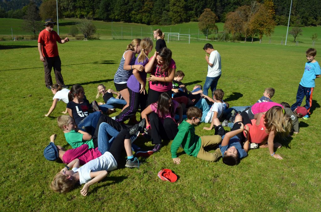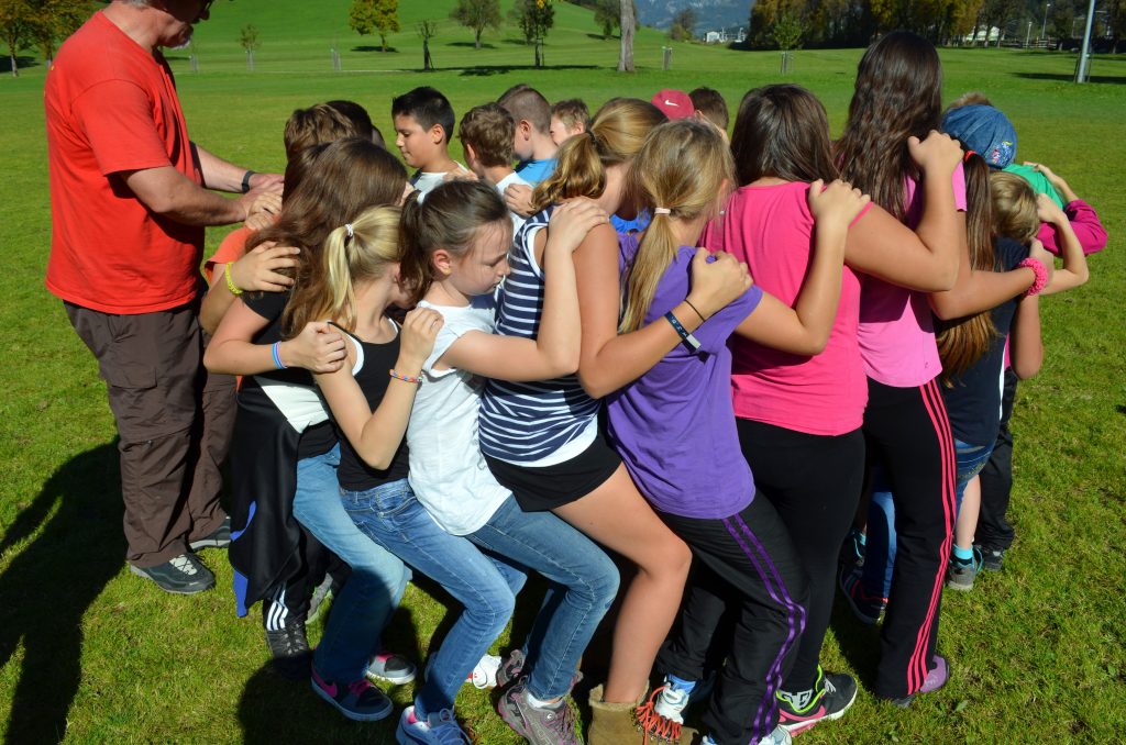 Danach marschierten wir zum Sportplatz, wo Manfred, unser Trainer, bereits auf uns wartete. Wir waren schon sehr gespannt, was er mit uns vorhatte. Manfred erklärte uns, dass er uns mithilfe von Spielen beibringen wollte, dass wir eine Gemeinschaft sind.