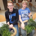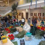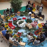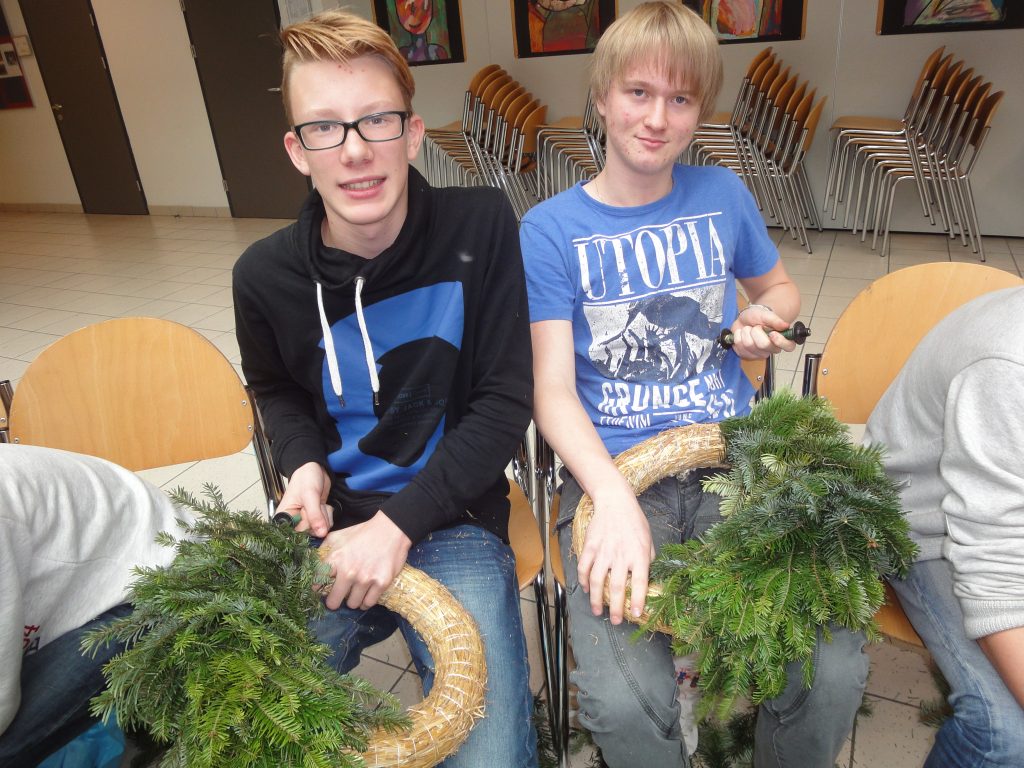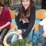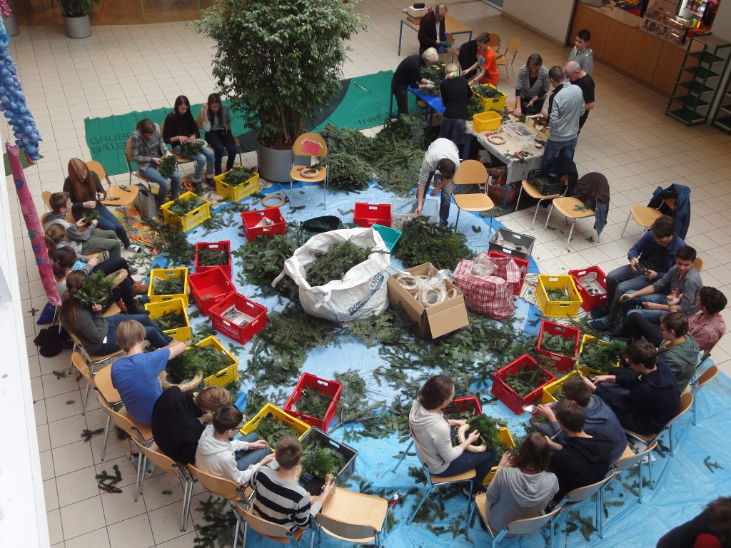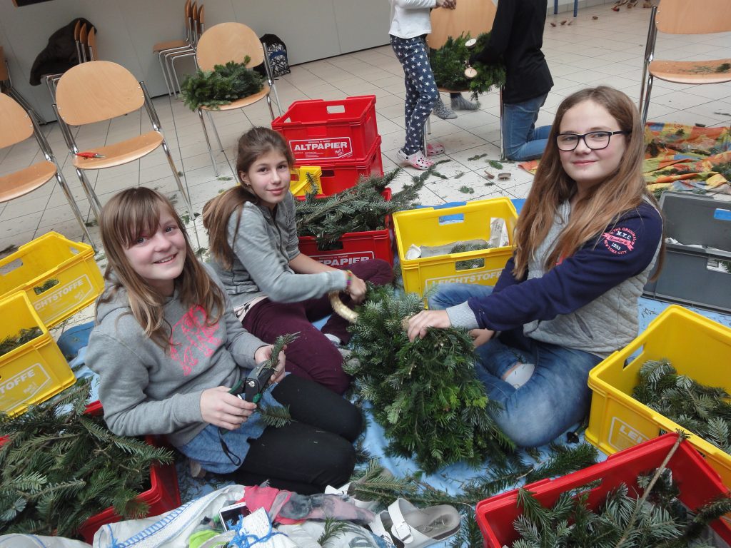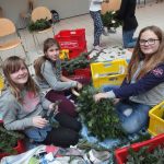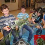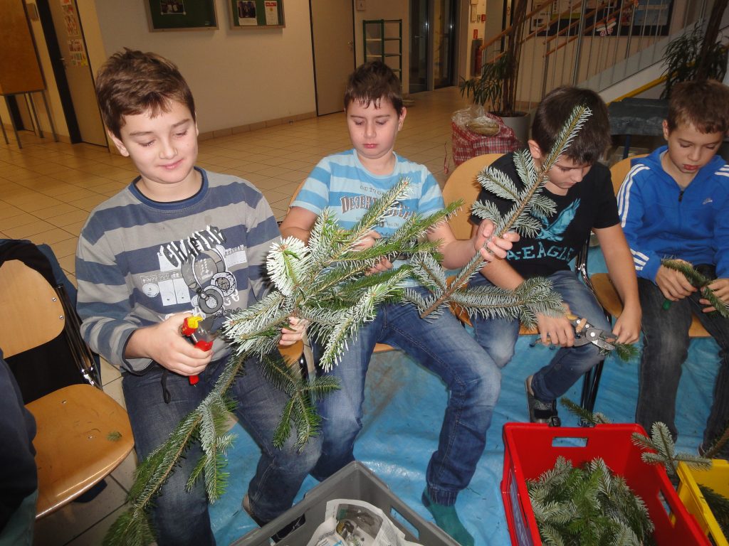Alle Jahre wieder.. und wieder war´s sehr schön… als sich die Aula mit weihnachtlichem Reisigduft füllte: Kinder sitzen auch am Boden – miteinander arbeiten, sich gegenseitig helfen, erzählen, lachen, zuerst frustriert den schlecht gebunden Kranz wieder öffnen, aber dann umso begeisterter von ihrem Prachtstück … Reisig richtig schneiden ist schon die erste Herausforderung, und erst recht das passende Reisigbüscherl an der passenden Stelle am Kranz zu platzieren, und den Bindedraht nach jeder Runde fest ziehen … so richtig feeest! Dabei mögen manche den Kranz buschig, andere glatt.