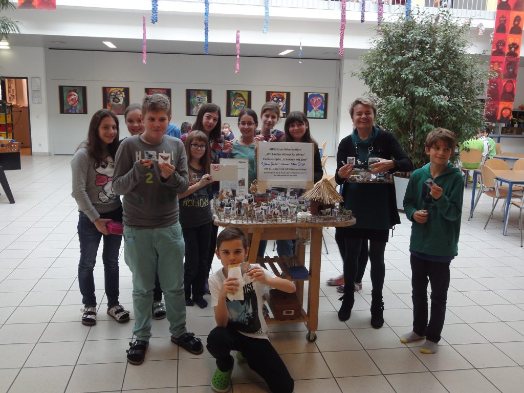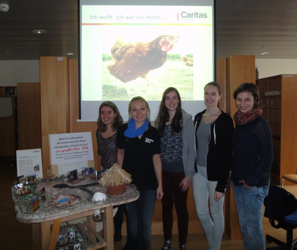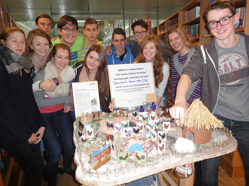 Bei der vorweihnachtlichen Aktion der Caritas „Schenken mit Sinn" konnte man sich auch heuer wieder aussuchen, wofür man für Bedürftige etwas kauft (spendet): eine Ziege, ein Hilfspaket für syrische Kinder, einen Fußball, eine warme Suppe, ein Gemüsefeld. Bei Kindern/Jugendlichen sind die Tiergeschenke sehr beliebt. Im letzten Jahr sammelt auch unsere Schule Geld für 2 Kamele und einen Esel. Heuer spendeten unsere Schülerinnen und Schüler Hühner. Denn mit 20 Euro kann eine Familie im Kongo eine Zucht mit drei Hühnern und einem Hahn starten! Und wir schafften 765 Euro! Davon können 153 Tiere gekauft werden, Hühner und Hähne!