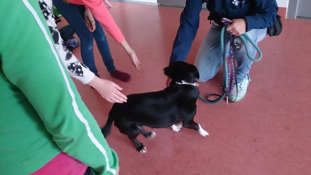 Und dann kam als Höhepunkt des Tages Frau Mag. Brigitte Girard mit ihren Therapiehunden Berillo, Citta und Alice. Wir hörten viel Neues über die „Arbeit", die diese Hunde machen. Und wir durften noch mit ihnen spielen. Das Tollste war, dass wir mit den Hunden an der Leine eine Runde gehen durften.