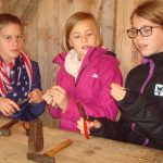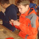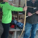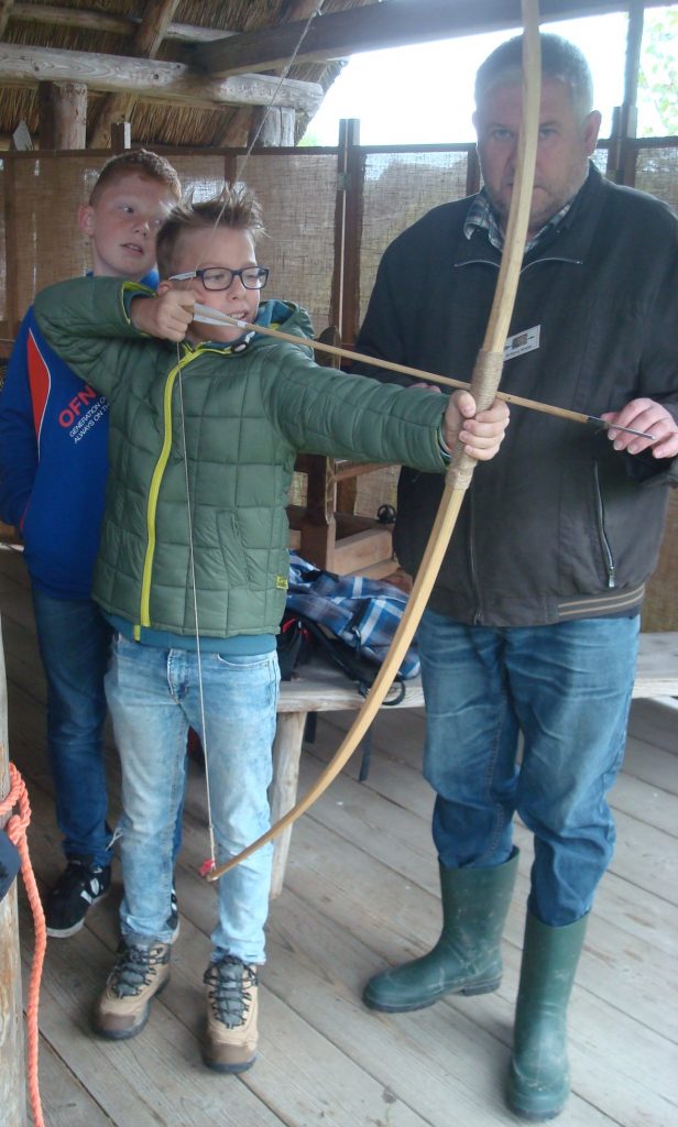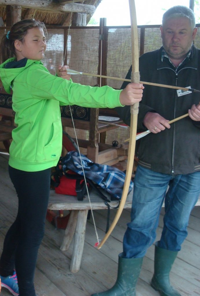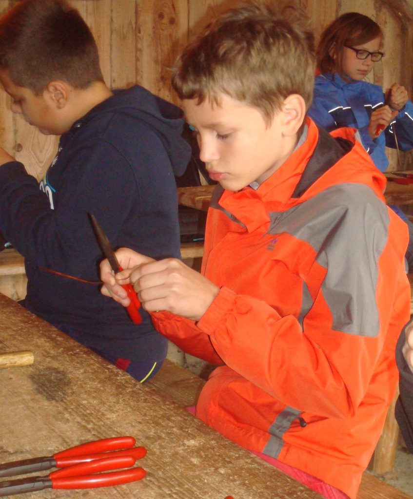 Nun teilten wir uns in drei Gruppen auf, um zu unseren jeweiligen Workshops „Metallarbeiten“, „Bogenschießen“ und „Töpfern“ zu gehen. Bei den Metallarbeiten entstanden wunderschöne Ringe, Anhänger und Armreifen. Die Töpfer kneteten erst den Lehm zu Ton, um dann schöne Gefäße, wie zum Beispiel Schüsseln, zu formen. Beim Bogenschießen galt es, sein Visier richtig einzustellen und das in etwa 15 Metern Entfernung positionierte (unechte) Wildschwein zu treffen. Obwohl nicht jeder Schuss ein Treffer war, hatten alle viel Spaß dabei.
