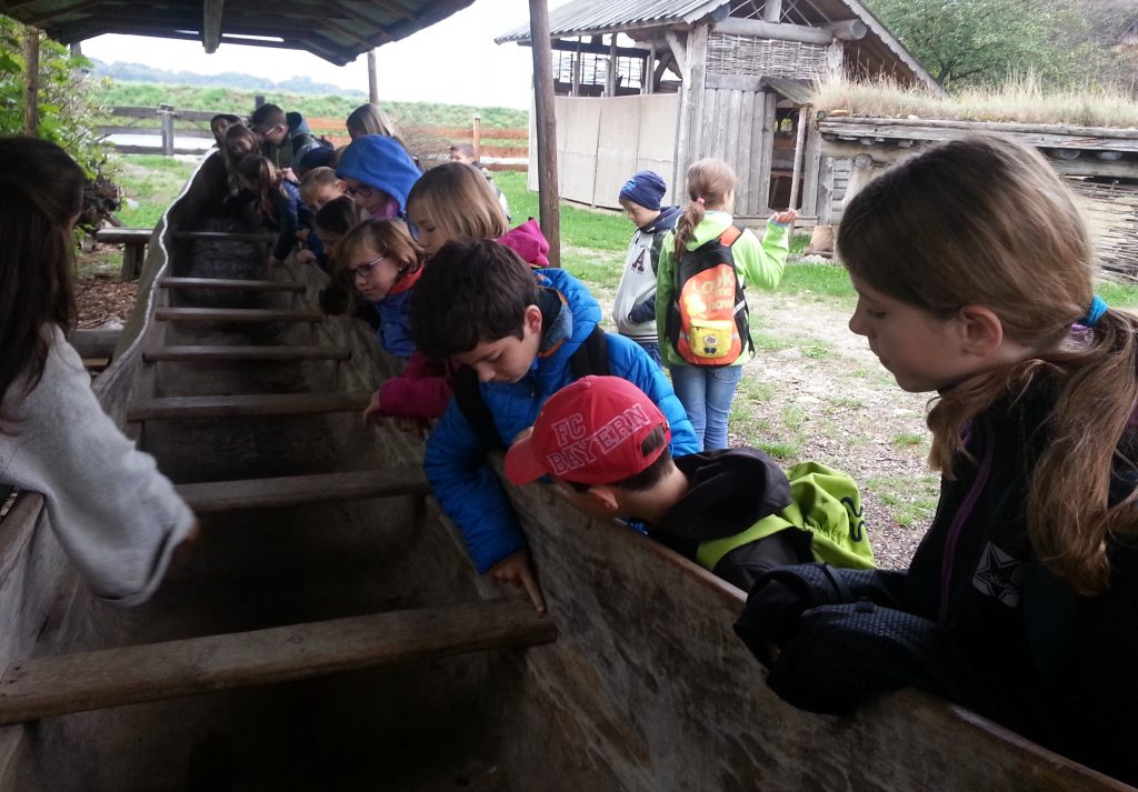 Danach sahen wir uns eine Doku über das Keltendorf in Mitterkirchen an. Im Anschluss erhielten wir eine sehr informative Führung, bei der wir viel über das Leben der Kelten erfuhren und verschiedene (nachgebaute) Bauten der Kelten, wie das Herrenhaus, das Sommerhaus, die Webhütte, den Getreidespeicher, den Grabhügel und den „Einbaum“, einen Bootstyp, der nur aus einem einzigen Baumstamm gefertigt ist, besichtigen durften. Besonders Mutige durften im Tierstall sogar die beiden Ziegen „Gangster“ und „Toni“ streicheln.