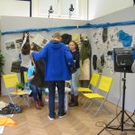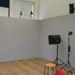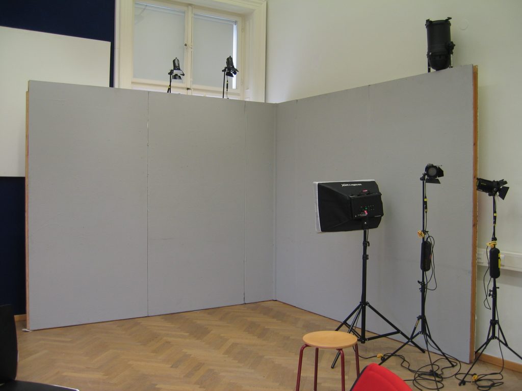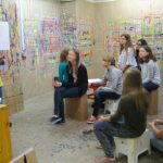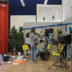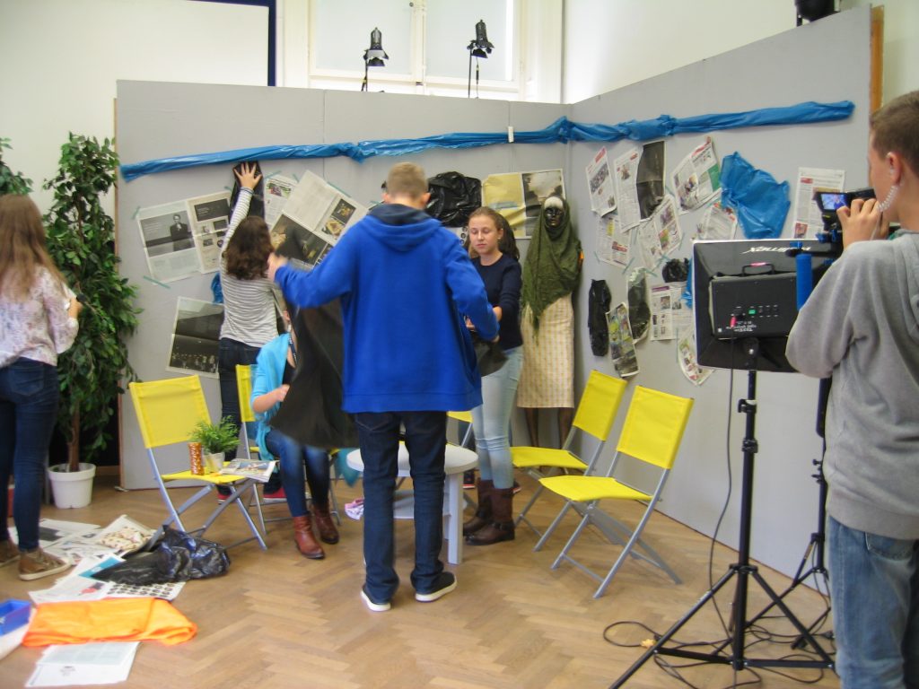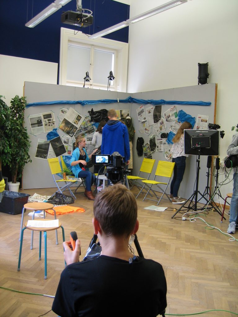 Da ich mich für alle Departements sehr interessierte, wartete ich ab, welche Jobs übrig blieben und meldete mich erst dann. Im Endeffekt war ich gemeinsam mit meinem Team für das Bühnenbild zuständig. Uns wurde ein großer Dachboden voller Möbel, Accessoires, alten Fernsehern und Pflanzen gezeigt. Aus diesen Einrichtungsgegenständen konnten wir auswählen und somit das Studioaussehen prägen. Abgesehen von den Sitzgelegenheiten für unsere Talkshowgäste, sollten wir auch den Hintergrund, also die Wände, passend zum Gesprächsthema gestalten. Der Kreativität waren in diesem Falle keine Grenzen gesetzt. Während die eine Hälfte unserer Arbeitsgruppe unten im Malkeller an der künstlerischen Gestaltung der Wände arbeitete, wählten die anderen in der Zwischenzeit passende Möbel aus und transportierten sie nach unten. Das Gesamtkonzept aus Vordergrund und Hintergrund musste stimmen, das heißt, wir besprachen uns oft und entschieden uns dann für eine Linie. Obwohl wir unter einem gewissen Zeitdruck standen, konnte sich das Endprodukt unserer Arbeit sehen lassen. Die Wände hatten wir mit unzähligen Zeitungsartikeln, die das Flüchtlingsthema behandelten, tapeziert. Über die Zeitungsausschnitte hatten wir zerrissene Müllsacke, die einerseits eine Art Flüchtlingszelt symbolisieren sollten und andererseits für das Chaos und den Müll innerhalb der Lager stehen sollten, befestigt. Das Bühnenbild veranschaulichte noch einmal die Lebensbedingungen der Menschen auf der Flucht. Für die Schauspieler – später Talkshowgäste – dienten gelbe, zusammenklappbare Campingsessel als Sitzgelegenheiten.