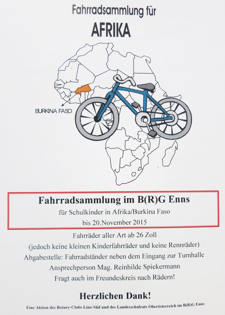 Der Rotary Club Linz-Süd startete mit dem Landesschulrat eine große Radsammelaktion für Afrika. An mehreren Schulen wurden Räder gesammelt für ein Dorf in Burkino Faso. Mit den Rädern können die Schulkinder leichter – oder überhaupt- in die Schule kommen, zudem werden Räder dort repariert und weiterverkauft, um die Infrastruktur (Schulen, Krankenhaus etc. ) des Dorfes zu verbessern.
