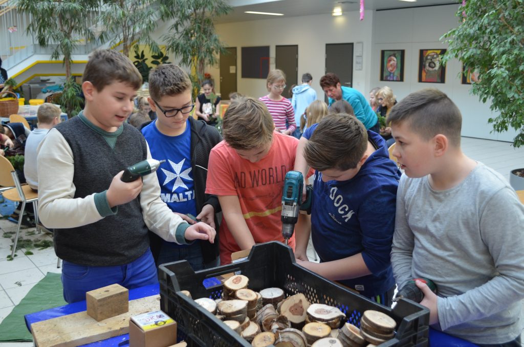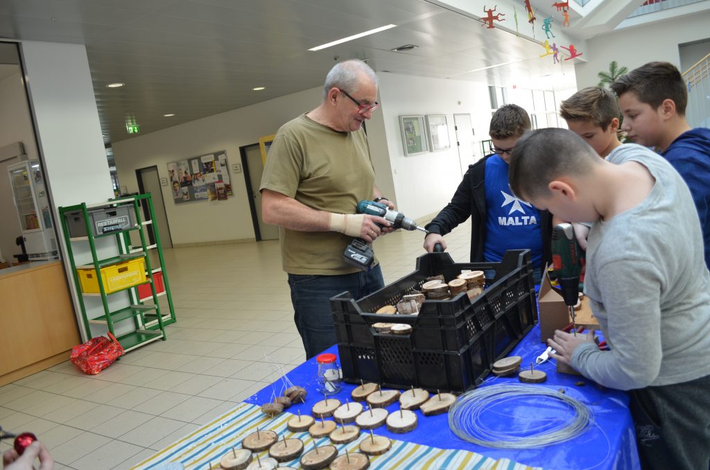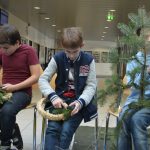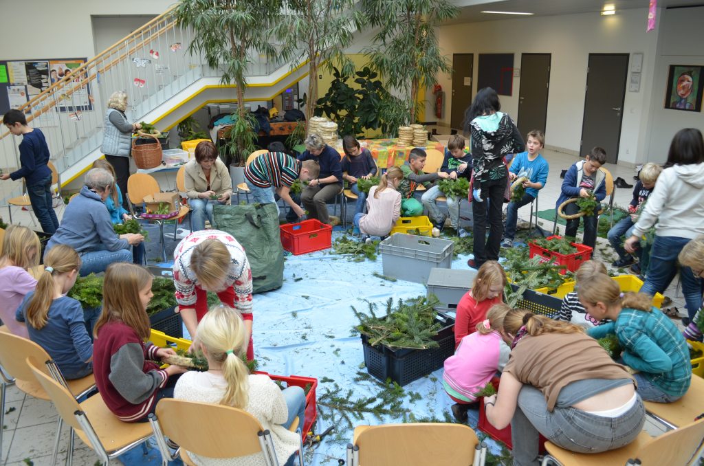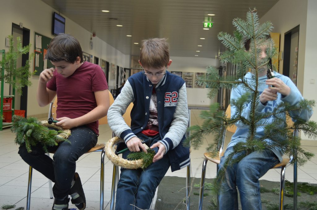 Die zweite Kerze konnte diesen Sonntag bereits entzündet werden: am selbstgebundenen und eigenhändig verzierten Adventkranz. Zu diesem „kreativen Miteinander“ trafen sich heuer die 1A, 2A, 3C und Schüler aus der Oberstufe, die diese Tradition weiterhin fortsetzen wollten. Still und weihevoll flackert es in diesen besinnlichen Stunden vielleicht auch in unseren Herzen – „mit den vier Lichtern auf dem grünen Ring weist uns der Adventkranz den Weg Richtung Weihnachtsfest. Das Grün symbolisiert das Leben und der Ring als Kranzform die Unendlichkeit“. Dieser christliche Brauch wird im Religionsunterricht bei Mag. Reinhilde Spiekermann „weitergetragen“ und praktisch umgesetzt. Dabei haben auch einige Lehrer, Eltern und heuer ganz besonders Herr Minichberger eine „tragende Rolle“.