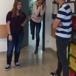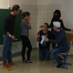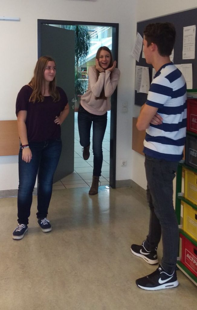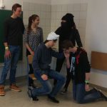 Dass dieses Thema tatsächlich begeistern kann, sollen die Szenenbilder verdeutlichen, die von den SchülerInnen zur ersten und letzten Szene erarbeitet wurden. Die Freude der aus dem Kaufmannshaus stürzenden Recha (Tamara Maelsevic) über die glückliche Heimkehr ihres (jüdischen) Vaters Nathan nach einer langen Schiffsreise (Markus Steinbatz), der mit Rechas (christlicher) Dienerin (Elisabeth Tauber) spricht, zeigen die Bilder 1 und 1a.