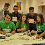 - (v.l.n.r.) Nassi, Asem, Arasch (stehend), Alexander, Julia, Lisa, Mehran beim Präsentieren ihrer selbstgebauten Holzspiele