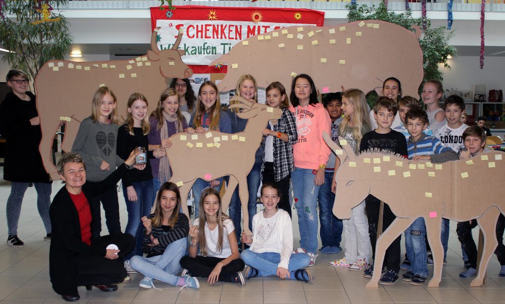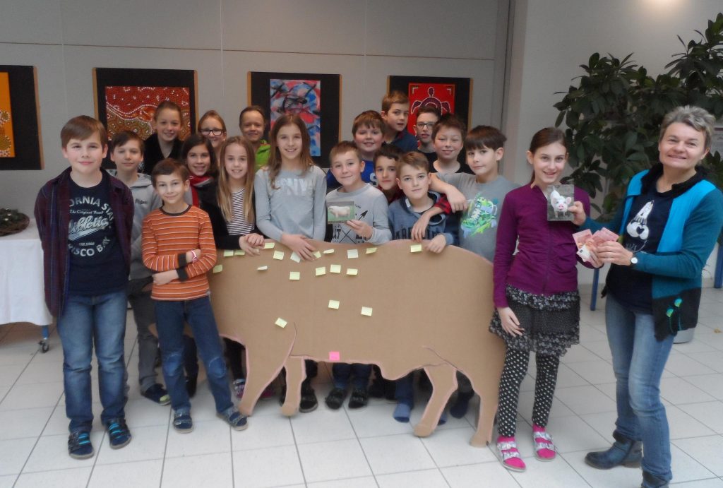 Die 1B-Klasse kaufte gemeinsam ein Schwein, die Mädchen der 2A schenkten 2 Ziegen und auch einige andere spendeten genug für ein „ganzes Tier“. In jeder großen Pause versammelte sich eine Schar von Schülerinnen und Schülern um nachzusehen, wieviel noch bis zum Spendenziel des „Lieblingstiers“ fehlte. Nach jeder Spende konnte man sich mit dem Namen auf einem der großen Karton-Tier verewigen. Vor allem am Elternsprechtag wurde noch einmal einiges an Geld beigesteuert, bevor die nun schon traditionelle Caritas-Spendenaktion erfolgreich abgeschlossen wurde.