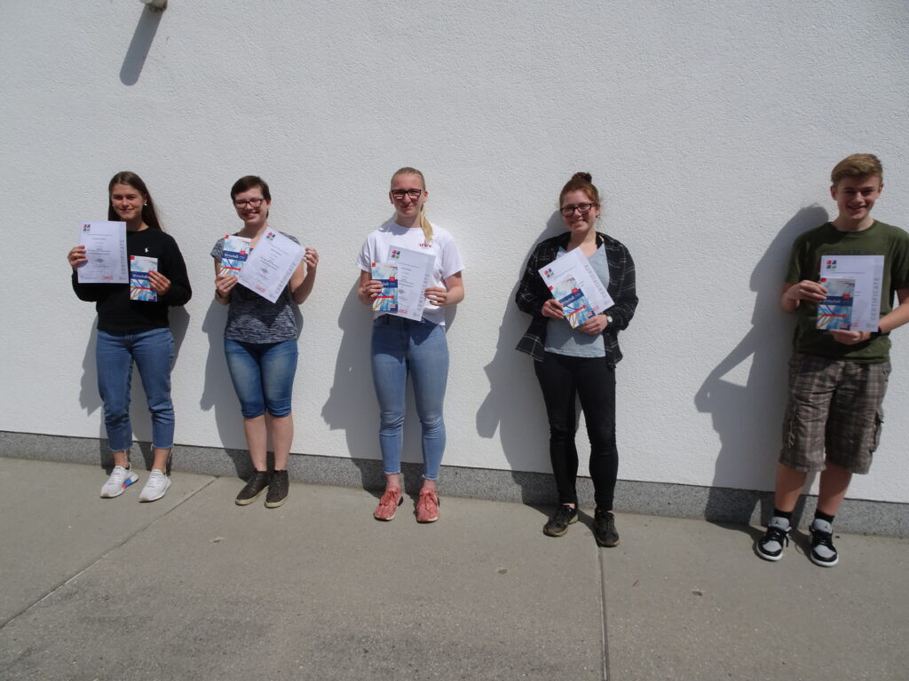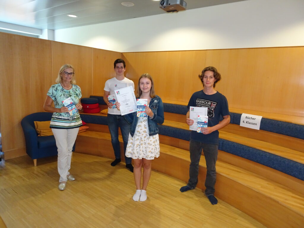 8 Schülerinnen und Schüler der 6. Klassen, die den Wahlpflichtgegenstand „Unternehmerführerschein“ in diesem Schuljahr gewählt hatten, absolvierten die 2. Teilprüfung, Modul B, wozu ein externer Prüfer an die Schule kam. Alle 8 Kandidaten (Christina Bayer, Maximilian Eder, Lisa Höfler, Philip Kalina, Lukas Mayr, Sarah Mittermayr, Viktoria Neumüller, Anna-Maria Pfisterer) bestanden die Prüfung mit „ausgezeichnetem Erfolg“. Wegen des coronabedingten Schichtunterrichts übergab ich meinen Schülerinnen und Schülern unter Beachtung der Abstandsregeln gruppenweise die Zertifikate sowie jeweils ein Exemplar des Buches „Wirtschaft – kurz erklärt“, das uns der Autor, Gottfried Kneifel, selbst gesponsert hatte.