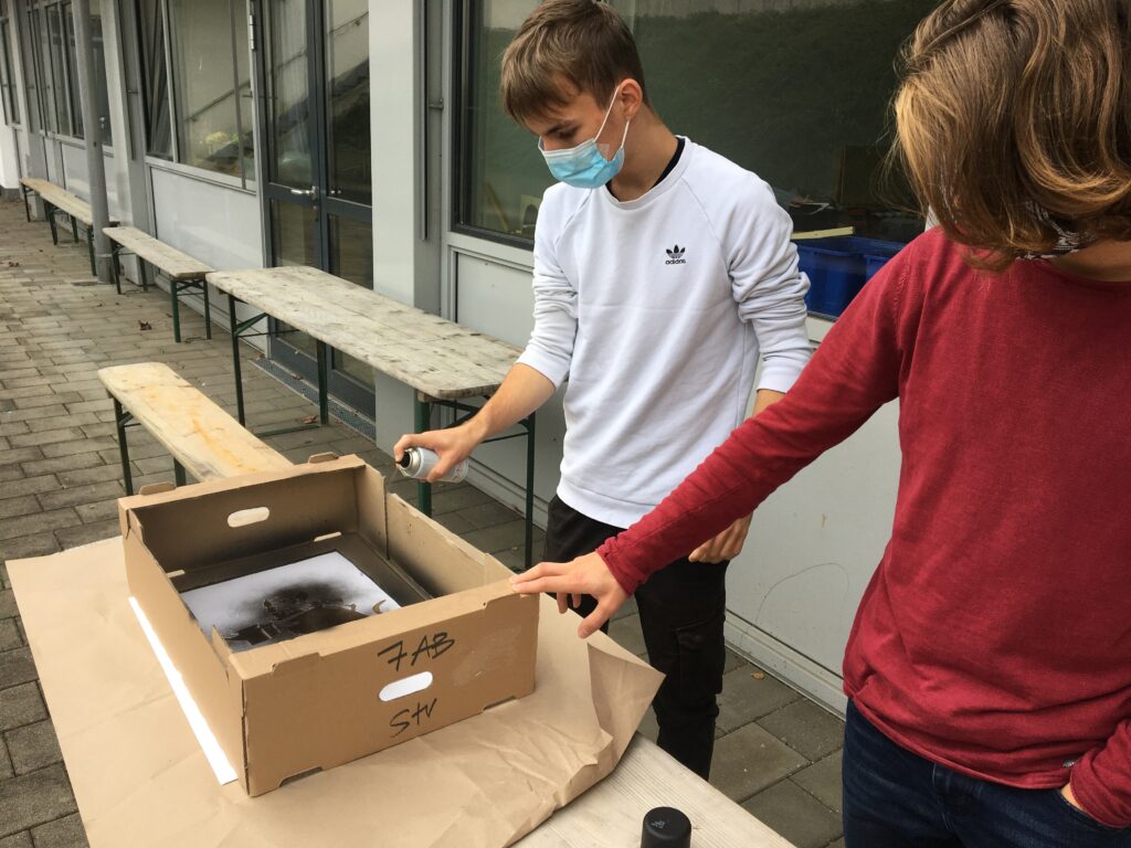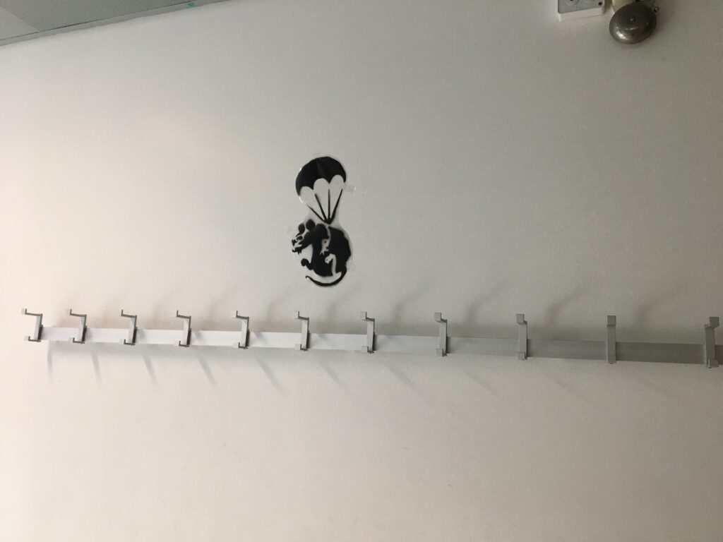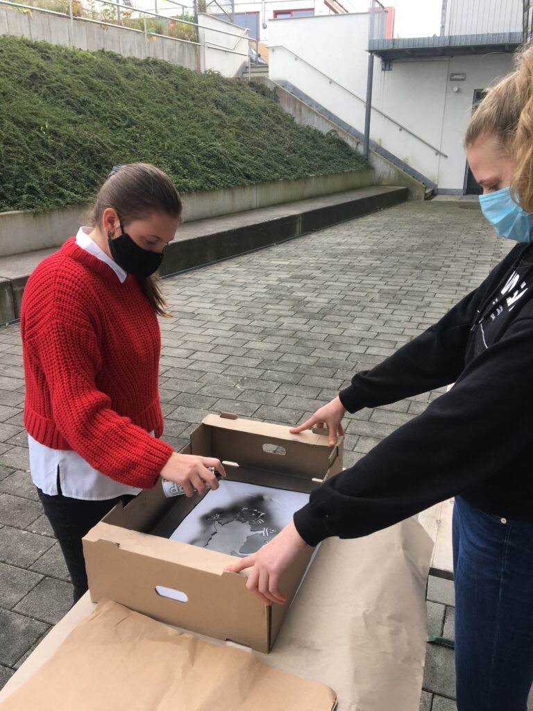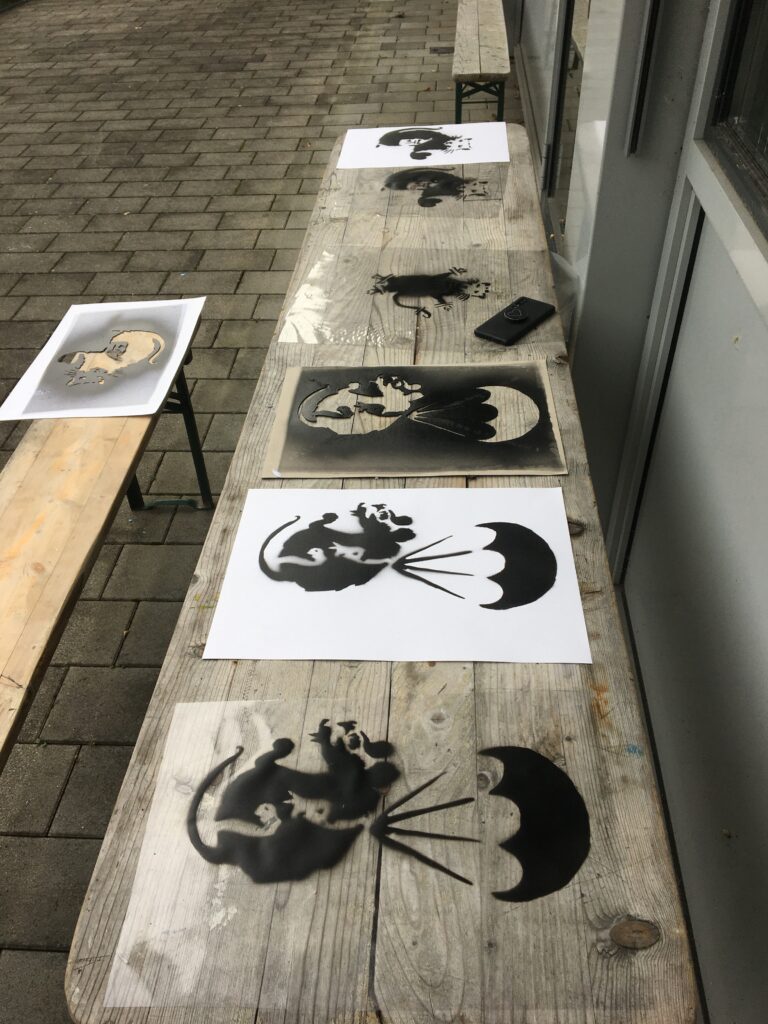 So fertigten die Schüler*innen der 7AB Stencils (Schablonen) an, mit denen auf Folien gesprüht wurde. Nach und nach werden sich immer mehr Ratten durch das Schulgebäude tummeln. Also danach Ausschau halten und die Botschaften auf sich wirken lassen!