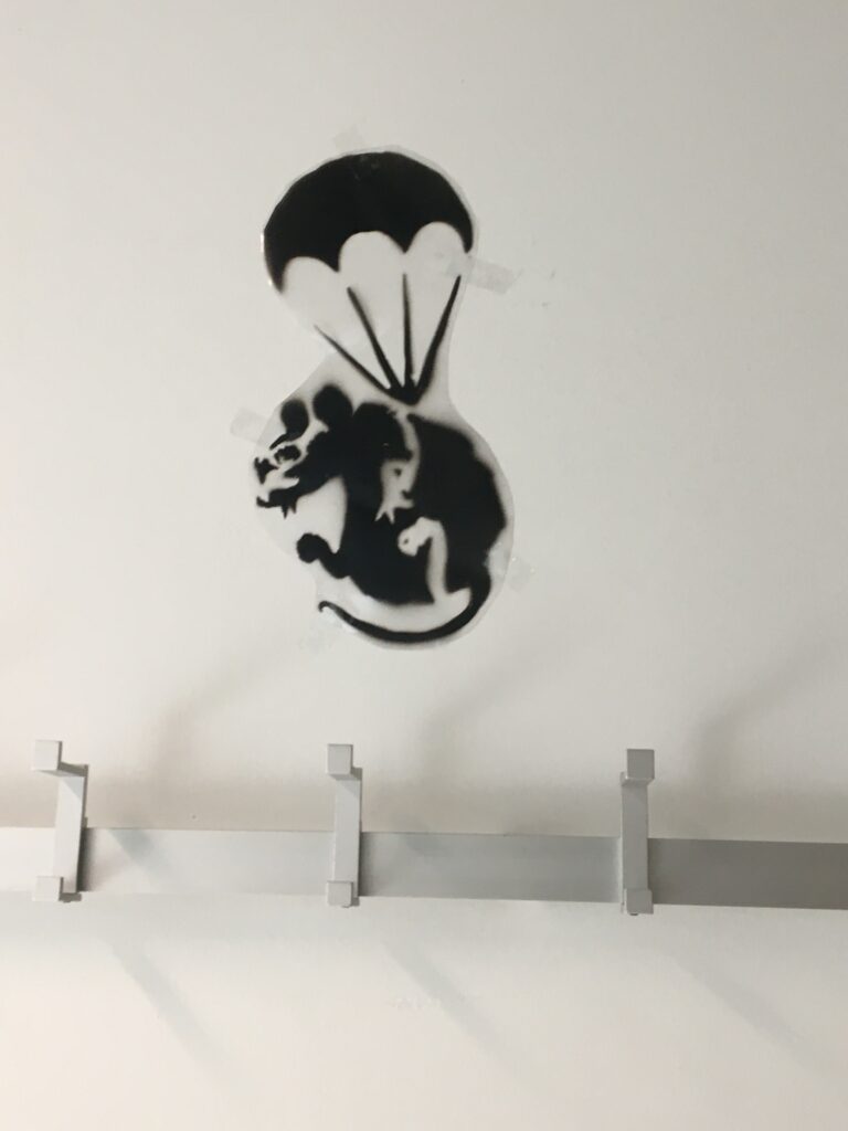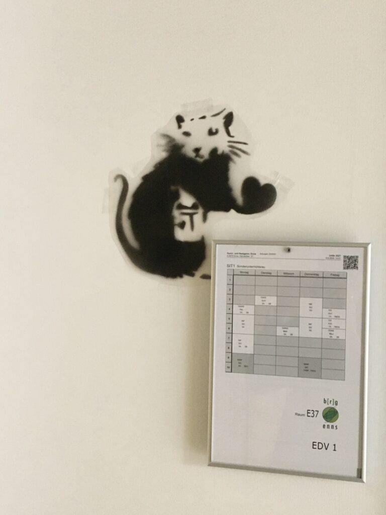 BANKSY, der mit seinem bevorzugten Motiv der Ratte, immer wieder aktuelle Themen anspricht, war viel mehr Ideengeber für die Graffitimotive der 7AB in Bildnerischer Erziehung.