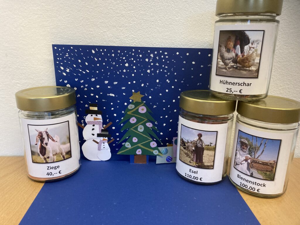 Im Rahmen der Caritas-Aktion „Schenken mit Sinn“ kaufen wir Tiere für Afrika: Hühner, Ziegen, Esel und Bienenstöcke. Die Tiergeschenke ermöglichen Familien in Afrika ein unabhängiges Einkommen und verändern somit das Leben der Beschenkten nachhaltig zum Besseren.