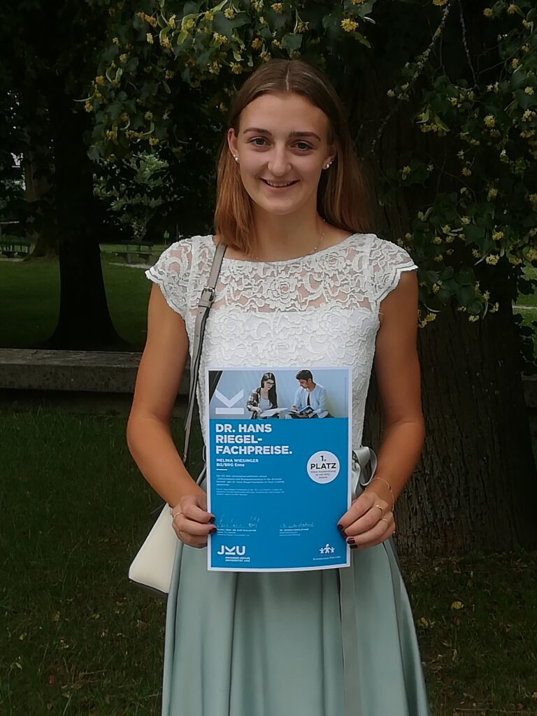 Melina Wiesinger 8A erzielte mit ihrer hervorragenden VWA „Daktyloskopie und Blutspurenanalyse in der Kriminaltechnik“ den ersten Platz des „Dr. Hans Riegel Fachpreises im Bereich Chemie“ der „Kaiserschild-Stiftung“ an der JKU Linz. Diese Fachpreise werden jährlich in den Fächern Mathematik, Physik, Chemie, Informatik und Biologie von einer renommierten wissenschaftlichen Jury der JKU aus den eingereichten Arbeiten ausgewählt. Der Fachjuror betonte in seiner Laudatio nicht nur die fachliche Richtigkeit, sondern vor allem auch die Originalität der Arbeit. Fr. Wiesinger kreierte dabei einen „Kriminalfall“, der von Schülergruppen mit Hilfe von Fingerabdrücken und Blutspuren (Blutgruppen, DNA) gelöst werden kann.