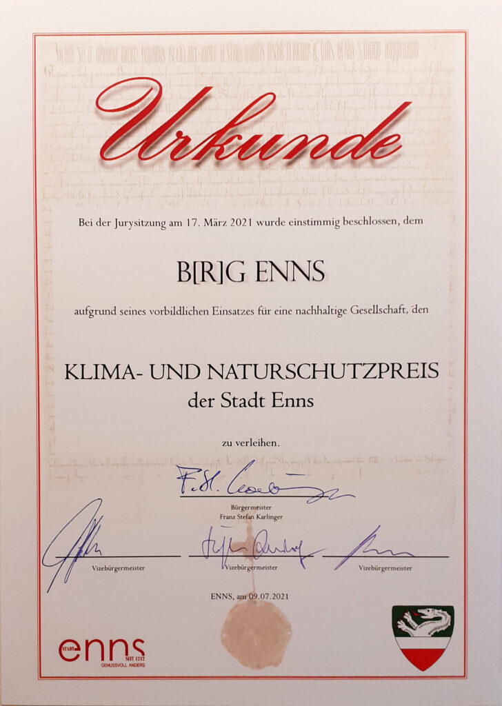 Das b[r]g Enns zählt zu einem von vier Gewinnern des von der Stadtgemeinde Enns ausgeschriebenen Preises, womit Lösungen im Bereich des Klima- und Naturschutzes bzw. der Bewusstseinsbildung dazu gewürdigt wurden, und darf sich über ein Preisgeld in der Höhe von 500 Euro freuen.