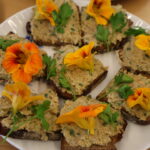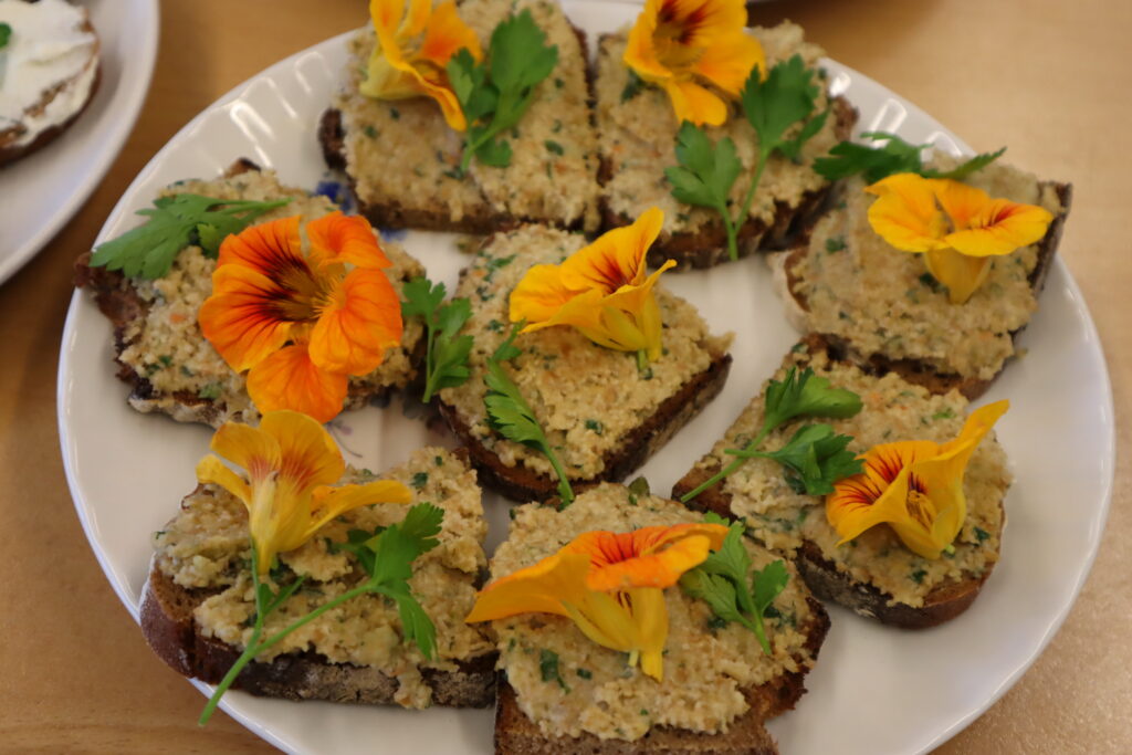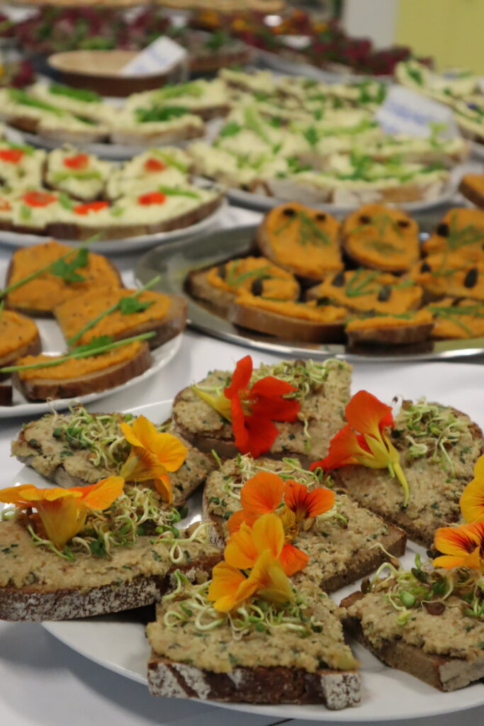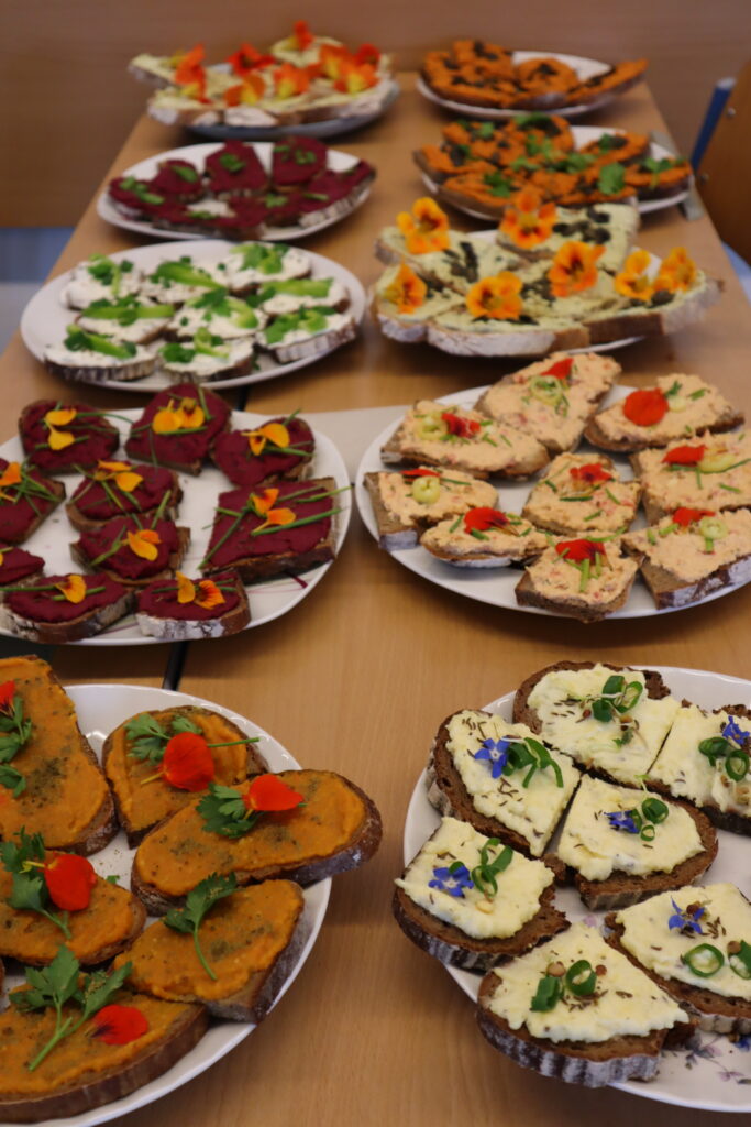 Regionale Betriebe (Bäckereien, Milchbauern, Gemüse- und Obstbauern) wurden kontaktiert und die Früchte der Saison wie Rote Rüben, Karotten, Kartoffeln, Äpfel, Paprika, Gurken, Tomaten, Kürbisse, Grünkern, Zwiebeln, Knoblauch usw., aber auch Kürbiskernöl, Topfen, Rahm und Joghurt wurden dazu verwendet, um leckere Aufstriche zu zaubern. Da aber, wie gesagt, „das Auge immer auch mitisst“, verzierten Blüten aus den Gärten die besonderen Aufstriche auf den Broten. So konnte auch gezeigt werden, dass es viele Blüten gibt, die essbar sind wie z.B. die blauen Blüten vom Borretsch, Blüten der Kapuzinerkresse, der Malve, des Gänseblümchens, der Kornblume und der Ringelblume. Es muss nicht immer etwas Exotisches sein, auch mit regionalen und saisonalen Produkten kann Wunderbares kreiert werden.