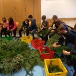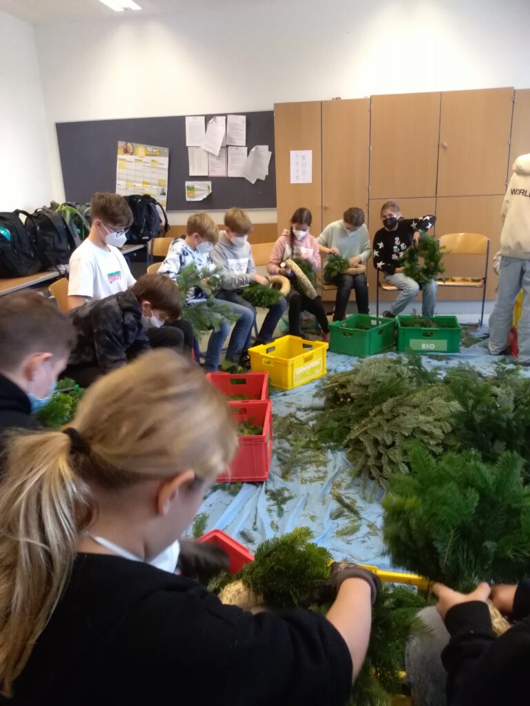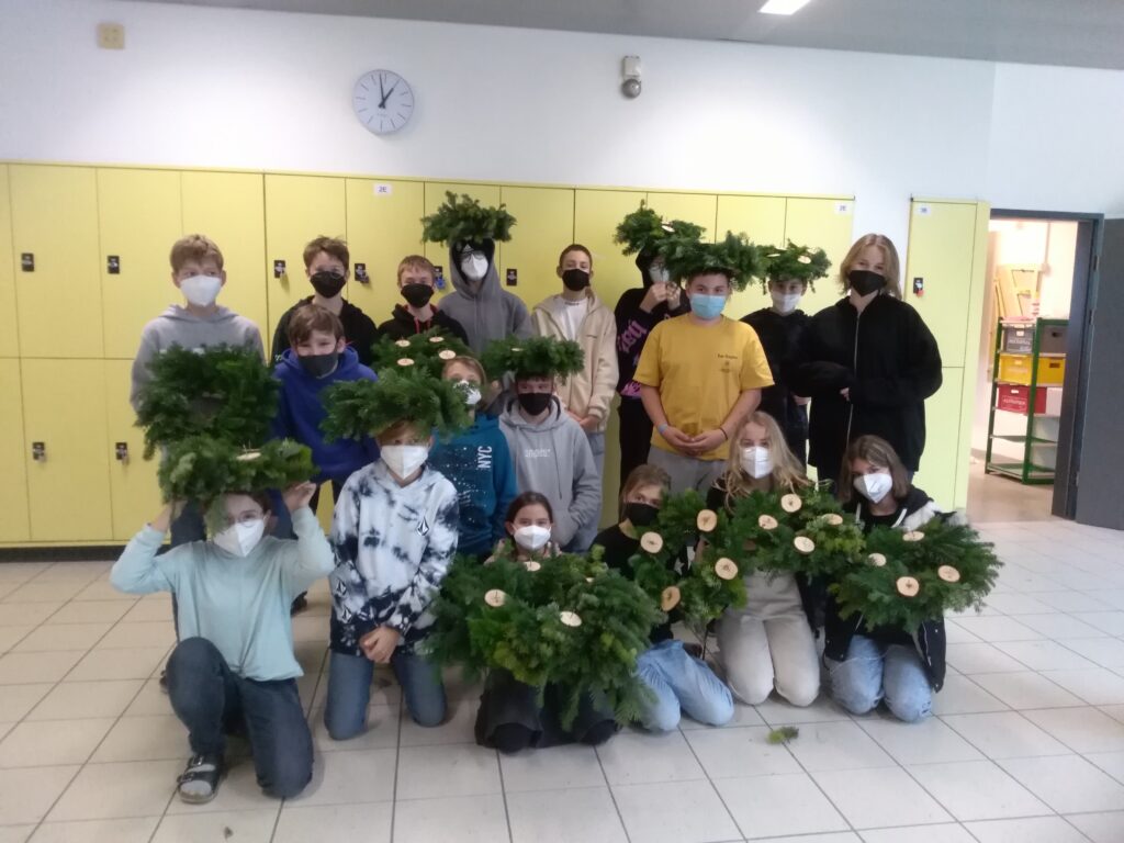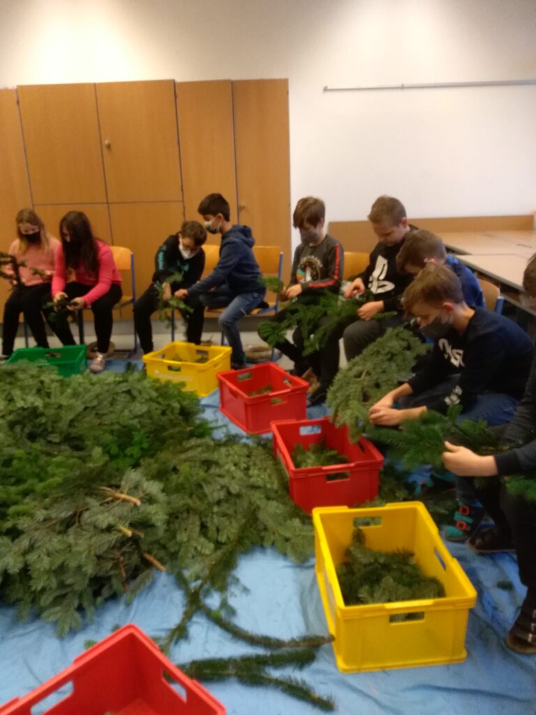 Endlich konnte eine alte Tradition und somit etwas Normalität in unserem Schulgebäude wieder gelebt werden. Die Tradition des Adventkranzbindens wurde von Kollegin Reinhilde Spikermann, die sich mittlerweile in Pension befindet, eingeführt und über viele Jahre jeden Donnerstag vor dem 1. Adventsonntag in der Schule mit Schüler*innen durchgeführt. Dabei wurden die jüngeren Schüler*innen in die Kunst des Kranzbindens von älteren eingeführt. Der Duft der Tannennadeln und das fleißige Arbeiten förderte nicht nur die Gemeinschaft, sondern verströmte im gesamten Schulgebäude die Vorahnung auf die Weihnachtszeit.