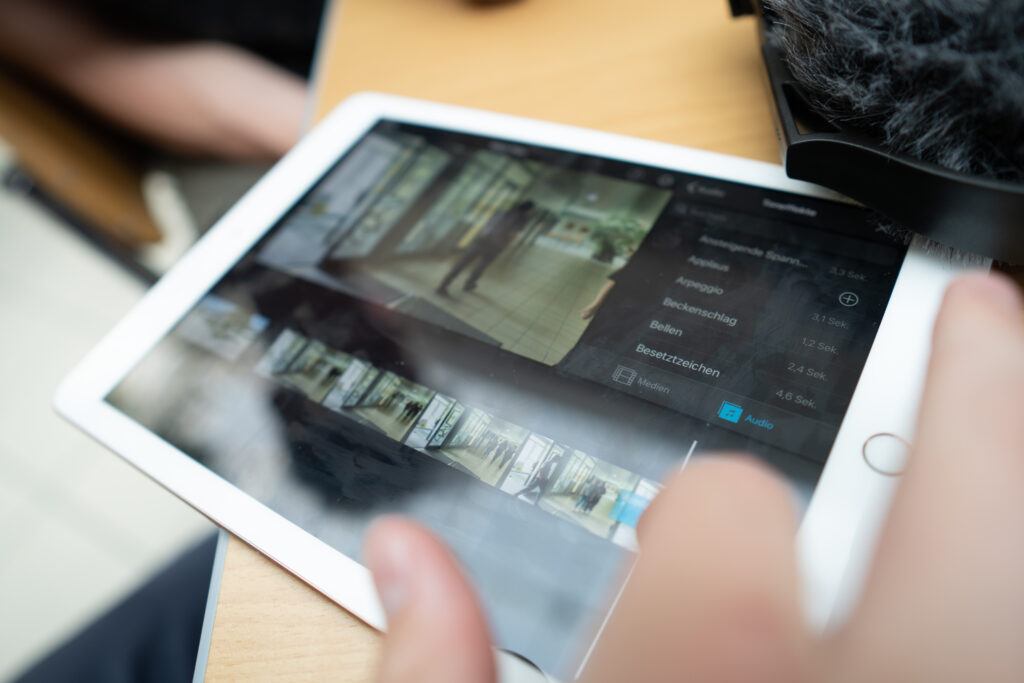Dabei lernten die Schüler*innen wie man an einem kleinen Filmset einen Kurzfilm mit einem Tablet drehen und schneiden kann. Nach einer kurzen theoretischen Einführung und Erklärung der Tools, ging es sehr schnell ins selbstständige Arbeiten.