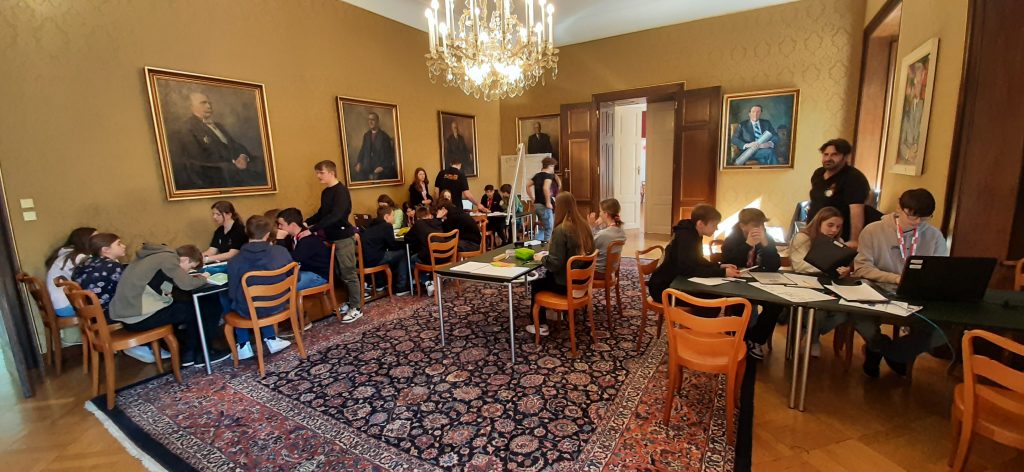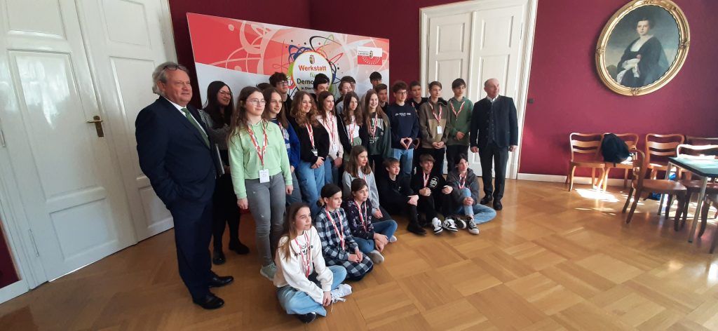 Am Ende des Workshops bedankte sich Herr Max Hiegelsberger, Präsident des Oberösterreichischen Landtages, persönlich bei allen Schüler*innen für die Arbeit und die aktive und gelungene Auseinandersetzung mit den demokratischen Werten und überreichte den Schüler*innen der Klasse 4D eine Urkunde.