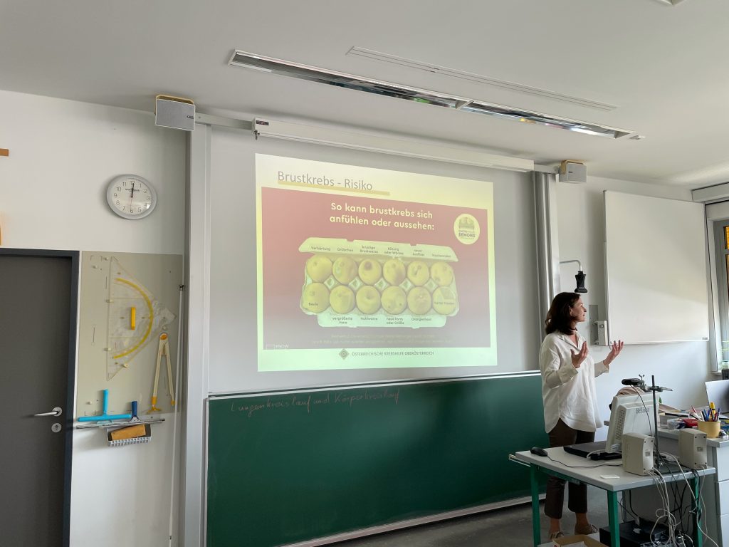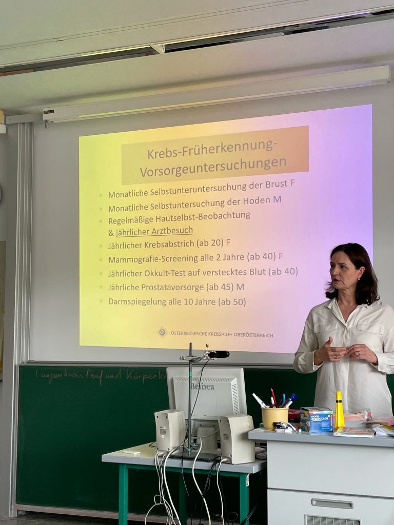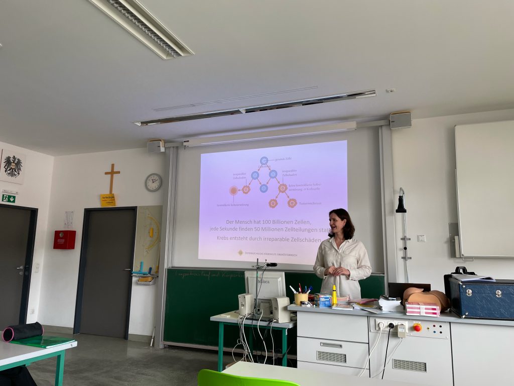 Die Schüler*innen der 8ABp und 8BBP, die über die molekularbiologischen Hintergründe zur Entstehung von Krebs bereits im Biologie-Unterricht informiert wurden, durften nun erfahren, wie Krebs verhindert bzw. frühzeitig erkannt werden kann.