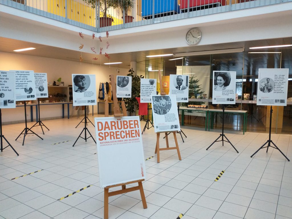 Die Ausstellung war im Dezember 2022 in der Aula zu sehen, ein bewusst gewählter Ort. Die Erfahrungen der Verfolgten fanden während der NS-Zeit inmitten der Gesellschaft, an dessen Rand sie gedrängt wurden, statt. Die Ausstellung soll den Zeitzeug*innen und ihren Erinnerungen in der symbolischen Mitte unserer Schulgemeinschaft einen Platz geben.