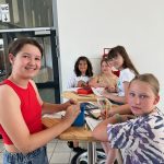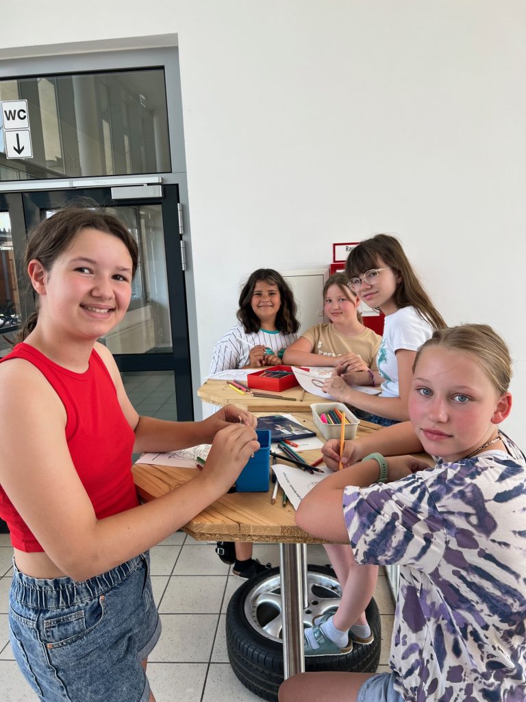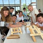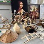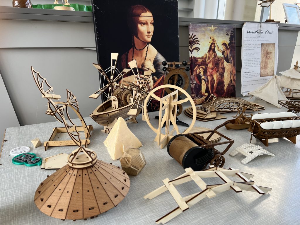 In der Leonardo-Werkstatt drehte sich natürlich alles um das Universalgenie Leonardo da Vinci. Besprochen wurde aber nicht nur die Geschichte rund um Leonardos Leben und seine berühmtesten Werke, sondern auch seine Erfindungen, seine technischen Konstrukte und Modelle. Die Schüler*innen konnten viel ausprobieren: die Leonardo-Brücke zum Drübergehen und in klein bauen, platonische und archimedische Körper nachbauen, der Goldene Schnitt wurde mittels goldenen Zirkels erkundet und vieles mehr. Trotz Hitze waren die Schüler*innen mit Begeisterung dabei.