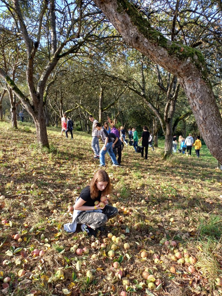 Die Schüler*innen der Klassen 3B und 3C durften an diesem Vormittag ein paar der alten Apfelsorten kennenlernen und kosten. Dazu zählten Sorten wie Klöcher Maschanzker (sehr schmackhaft), der Mauthausner Linoniapfel (eher sauer, wie der Name schon sagt) oder die besondere Sorte Frankfurter (schmeckt sehr aromatisch nach Apfel und nicht nach Wurst). Ebenso wurde von Herrn Richard Mahringer (Experte für Permakultur und Obstbaumvermehrung), der uns durch die Streuobstwiesen führte, die Bedeutung der Erhaltung von alten Apfel- und Birnensorten erklärt und ein geschichtlicher Hintergrund geliefert.