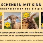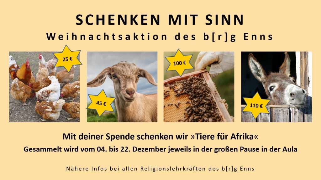 Das b[r]g Enns unterstützt auch heuer wieder die gleichnamige Aktion der Caritas und verschenkt Tiere an Familien in Afrika. Wir sammeln vom 04. bis 22. Dezember jeweils in der großen Pause in der Aula, freuen uns über zahlreiche Spenden und sind gespannt, wie viele Tiere wir heuer schlussendlich kaufen und verschenken können. Ein herzliches Dankeschön im Voraus an alle, die uns dabei unterstützen.