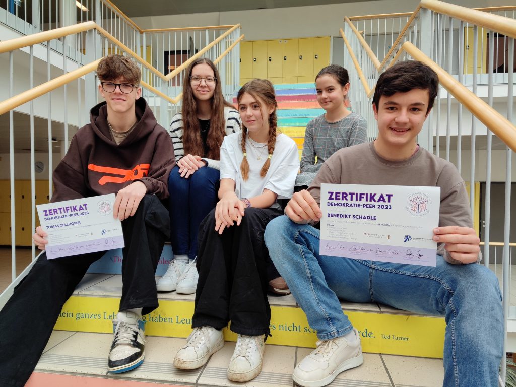 Paula Barisic, Christina Hofer, Leni Reiter, Benedikt Schädle und Tobias Zellhofer aus unseren 5. Klassen haben in diesem Schuljahr eine mehrtägige Ausbildung in Linz absolviert, um in Zukunft Workshops in Unterstufenklassen abhalten zu können, in denen sie mit Schüler*innen Grundwerte der Demokratie und wesentliche Prinzipien politischer Systeme diskutieren werden.