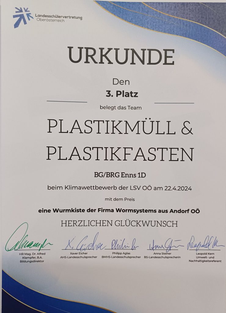 Am 22.04.2024 erfolgte die Preisverleihung am Klimawettbewerb der LSV OÖ in der Bildungsdirektion in Linz. Dazu fuhren alle Schüler*innen der Klasse 1D mit ihrer Klassenvorständin Frau Prof. Heike Moser und ihrem Deutschlehrer Herrn Prof. Daniel Gallner nach Linz. Die Preisverleihung fand um 15.00 Uhr in der Bildungsdirektion statt. Vertreter der Landesschülervertretung, des Klimabündnisses sowie der Bildungsdirektor Alfred Klampfer begrüßten die eingeladenen Teilnehmer*innen am Klimawettbewerb. Es wurden die ersten bis dritten Plätze vorgestellt und vergeben. Die Klasse 1D durfte sich über ihren dritten Preis (eine Wurmkiste und eine Urkunde für ihre Klasse) freuen.