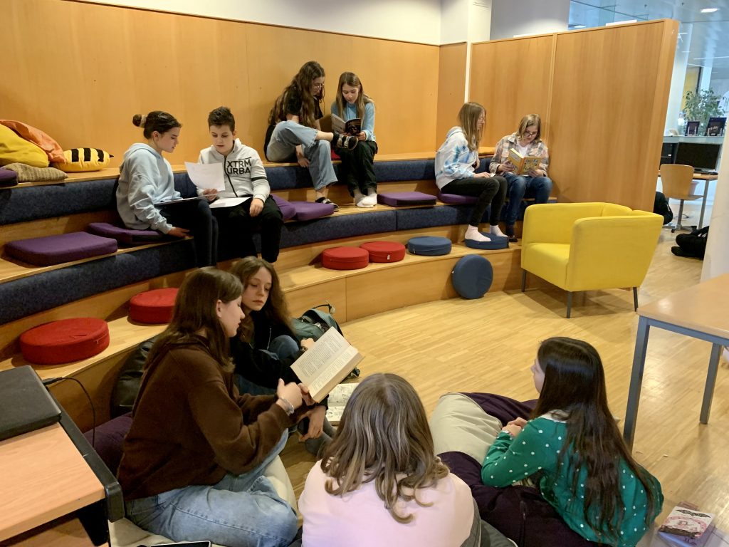 Für ein besonderes Projekt trafen sich die 5B und die 1D, um sich gegenseitig aus ihren englischen Büchern vorzulesen. Dabei zeigten die Erstklässler*innen, wie viel sie in diesem Jahr schon in Englisch gelernt haben während die Fünftklässler*innen die jüngeren Schüler*innen motivierten, weiterzulesen und zeigten, was bis zur Oberstufe alles möglich ist. Der Spaß war groß und schon beim Läuten wurde der Wunsch laut, diese Aktion bald zu wiederholen.