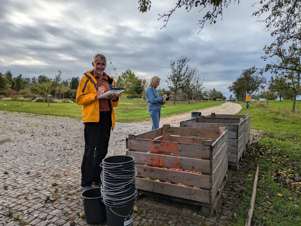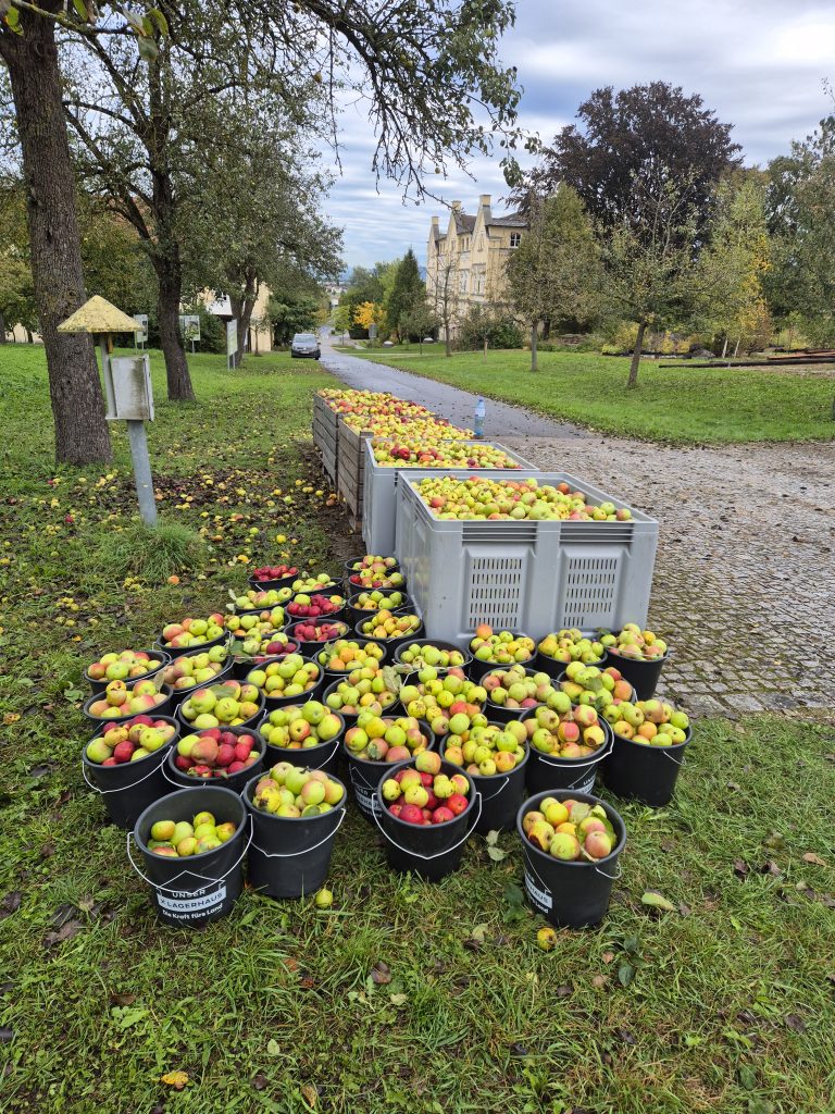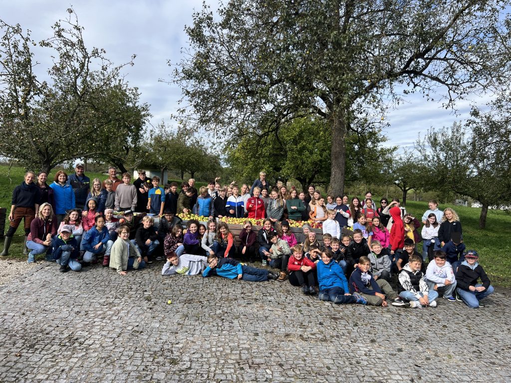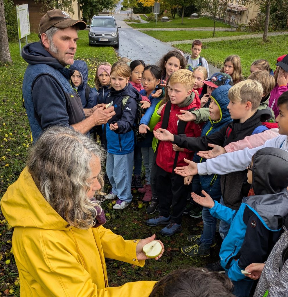 Im Anschluss an die Einführung strömen die Schüler*innen aus auf die Streuobstwiese, wobei die Schüler*innen der 3. Klassen in einer motivierenden Challenge herausfinden wollen, wer das meiste Obst sammelt. Es werden kübelweise Äpfel zurückgebracht, große Erntekisten befüllt und zwischendurch wird fleißig gekostet und darüber geredet, wie sich die vielen Sorten unterscheiden, und Hinweise über Bäume mit den „allerbesten Äpfeln“ an andere Schüler*innen weitergegeben.