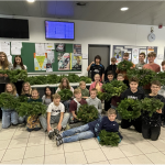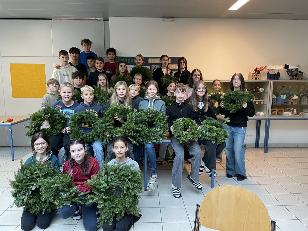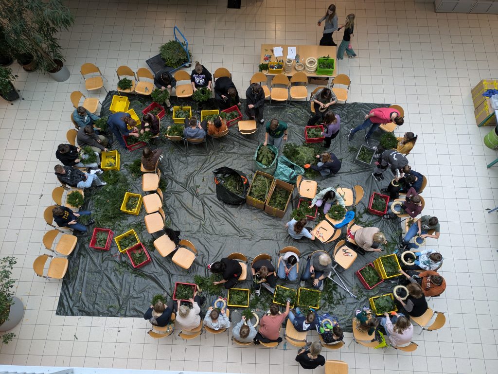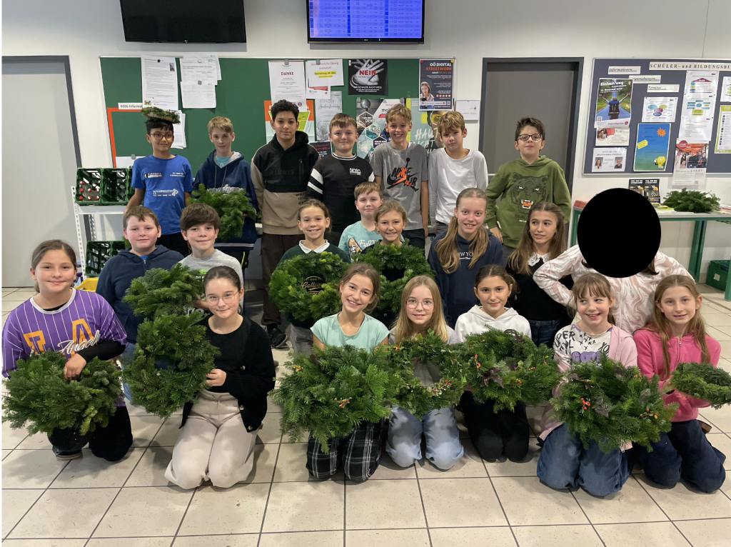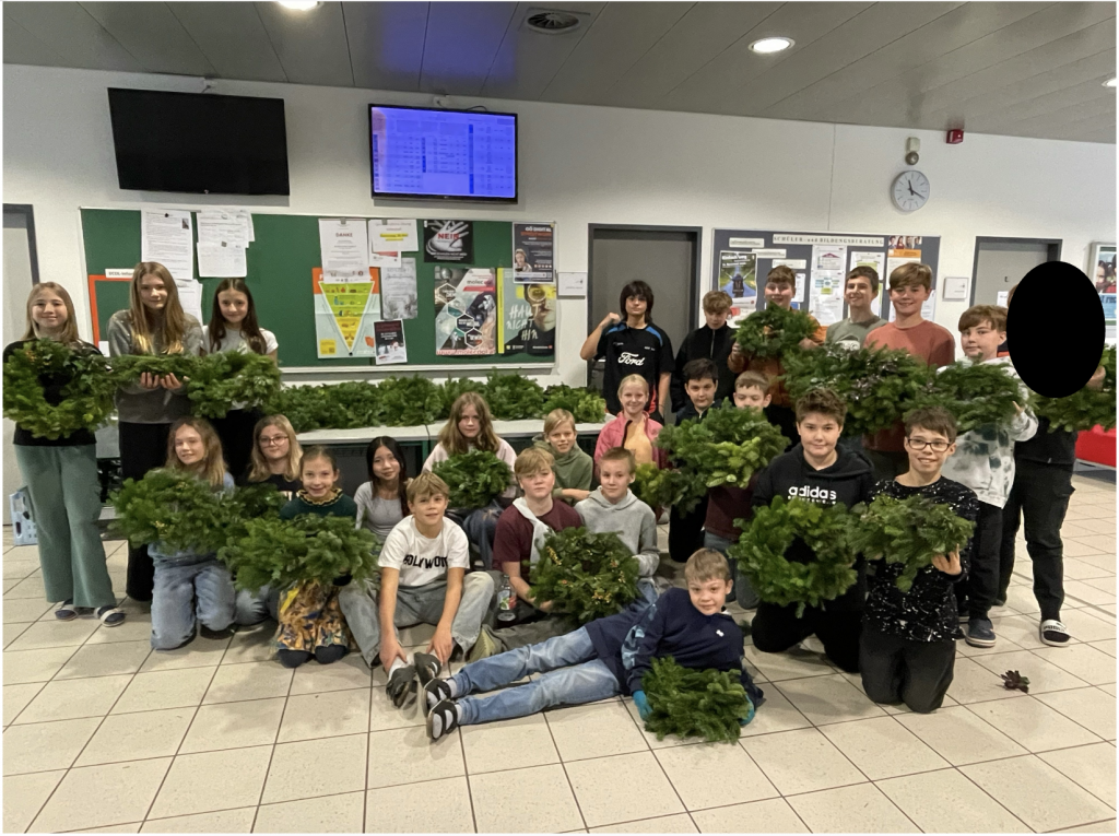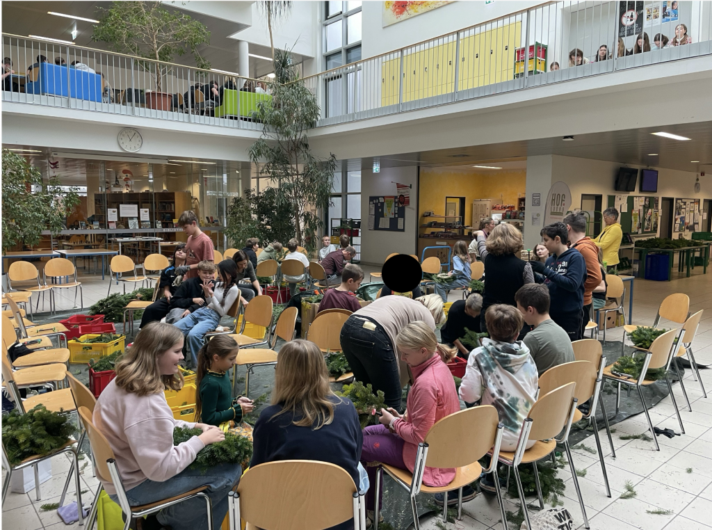 So wie im Film „Dinner for One“ das Essensritutal jedes Jahr wiederholt wird, wiederholen wir das Kranzbinden jedes Jahr und füllen das Schulhaus mit Tannenduft, fröhlichen Gesichtern, viel Kreativität und ganz viel Motivation. Viele kleine und große Künstler*innen zeigen, was sie können, auch, wenn sie noch nie einen Adventkranz gebunden haben. Beeindruckend, wie viel Fingerspitzengefühl, motorisches Können und Fantasie hier zum Vorschein kommen.