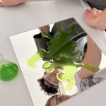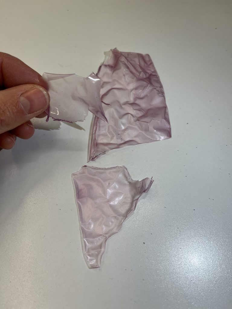 Zusätzlich haben wir noch Glycerol (einen umweltfreundlichen Weichmacher) und etwas Lebensmittelfarbe (grün und lila) dazugegeben. Die noch heiße Masse wurde auf einer Spiegelplatte verteilt und musste dann trocknen. Und es ist tatsächlich geglückt: ein paar Tage später hatten wir unsere erste selbstgemachte, biologisch abbaubare Folie in den Händen!