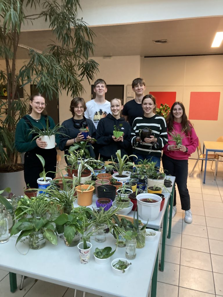Im Rahmen des Wahlpflichtfaches Generation Zukunft wurden von Schüler*innen mitgebrachte Zimmerpflanzen geteilt und so vermehrt. Hierbei ist es wichtig, die Wurzeln nicht zu sehr zu beschädigen, kleine Schäden hingegen können sich jedoch sogar positiv auf das Wurzelwachstum auswirken. Wir versuchten unser Glück mit unterschiedlichen Methoden: Wir säten Samen, trennten Tochterpflanzen, Adventivpflanzen, Ableger und Ausläufer, und versuchten auch die Rhizomteilung und die Stecklingsvermehrung.