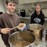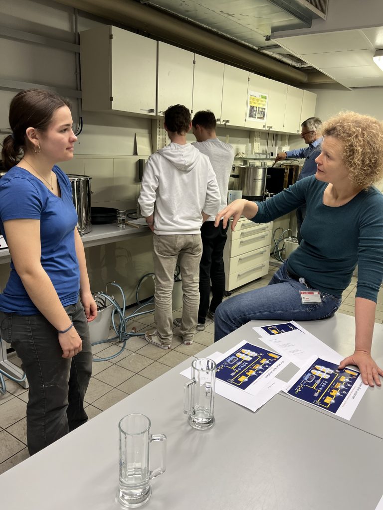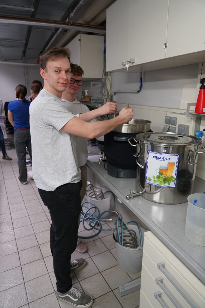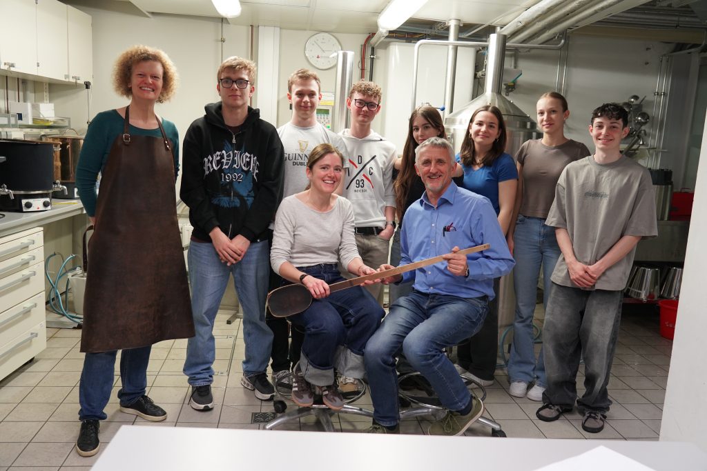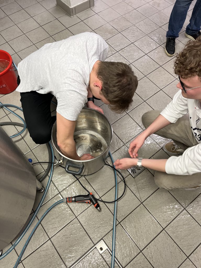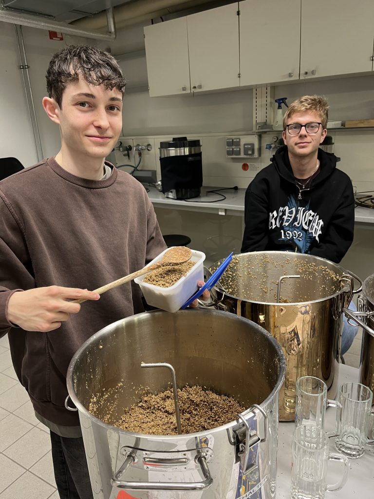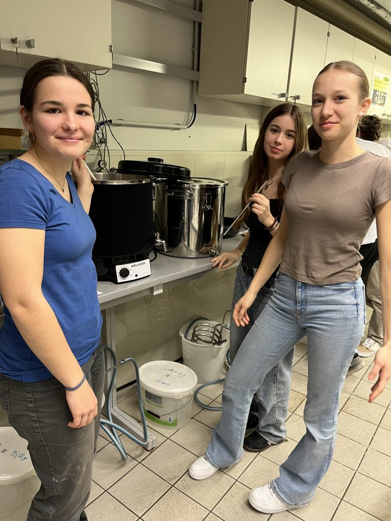 Im Rahmen einer Exkursion unserer Wahlpflichtfachgruppe Chemie fuhren wir am Donnerstagnachmittag mit dem Zug zur FH Wels, wo wir sofort mit dem praktischen Arbeiten begannen. Während des Einmaischens wurden wir von FH-Prof. Dr.-Ing. Kathrin Mathmann vom Fachbereich Lebensmitteltechnologie über die wesentlichen biochemischen Prozesse beim Bierbrauen aufgeklärt. Dabei wurden auch Grundlagen des Bierbrauens besprochen, insbesondere die verschiedenen Rohstoffe sowie historische Aspekte, wie die Aufhebung des Braurecht im Mittelalter, um das knappe Getreide fürs Brotbacken zu reservieren. Ebenso erfuhren wir, dass Hopfen bevorzugt entlang des 45. Breitengrads gedeiht, weshalb Regionen wie Österreich, Tschechien und Deutschland seit jeher zu den bedeutendsten Anbau- und Braugebieten zählen. Insgesamt brauten wir mit einer Mischung aus drei verschiedenen Malzsorten etwa 100 Liter untergäriges Bier. Als Braugefäße dienten uns große Behälter, wie man sie von Punschständen kennt. Gleichzeitig erhielten wir spannende Einblicke in die modernen Anlagen von Großbrauereien und erfuhren, wie sich industrielle Prozesse von der handwerklichen Herstellung unterscheiden.