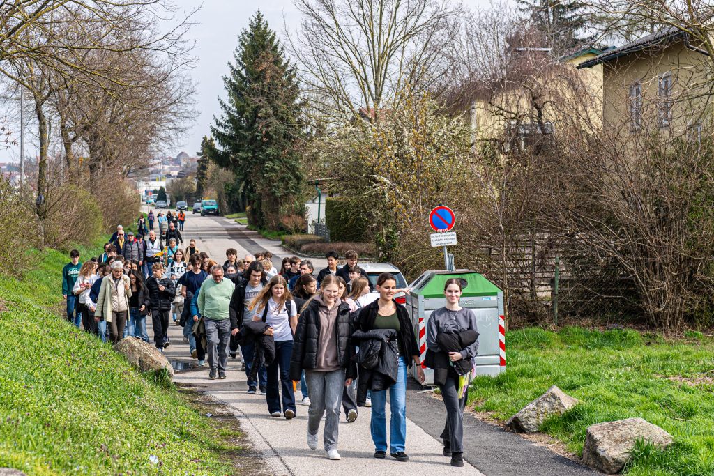 Am Nachmittag hatten die Schüler*innen der 5. Klassen die Möglichkeit mit Jack Hersch an diesem, vom Mauthausen Komitee Enns organisierten Gedenkmarsch, teilzunehmen. Gemeinsam besuchten sie Orte, die im Leben von David Hersch eine bedeutende Rolle einnahmen, darunter Orte der Verfolgung entlang der sogenannten Todesmärsche, als auch Orte der Solidarität, wie das Haus der Familie Friedmann, in dem David Hersch versteckt wurde.