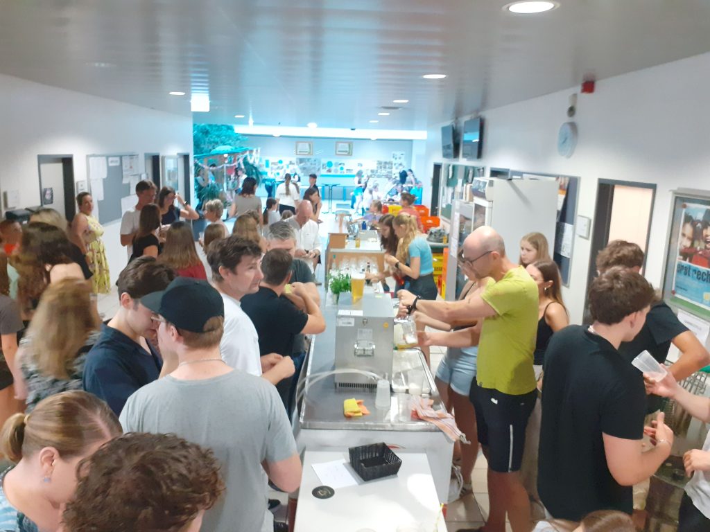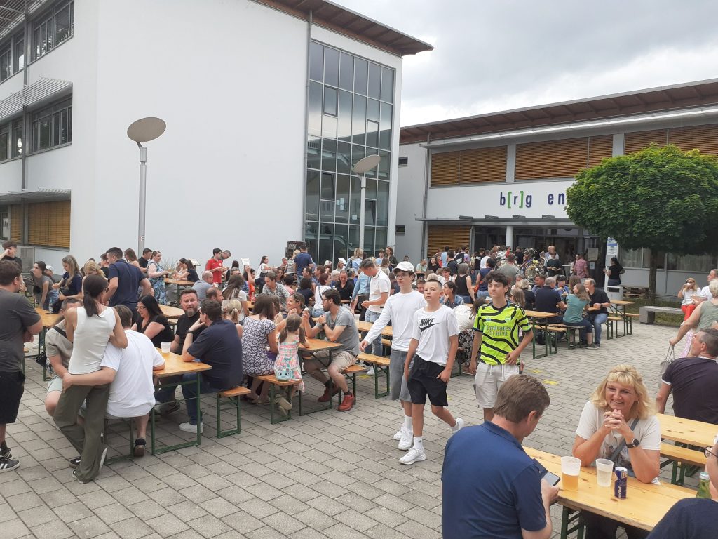 Mit einem riesigen Salatbuffet, Leberkäse, einem Eisstand und einem großzügigen Kuchenbuffet verwöhnte der Elternverein die zahlreichen Gäste mit leckeren Speisen. Die Cocktailbar der Peers, die Getränkebar des Elternvereins und die Bierschank der 7. Klassen sorgten dafür, dass die vielen Besucher*innen bestens versorgt waren und bis in die Dunkelheit hinein gemütlich zusammensitzen konnten.